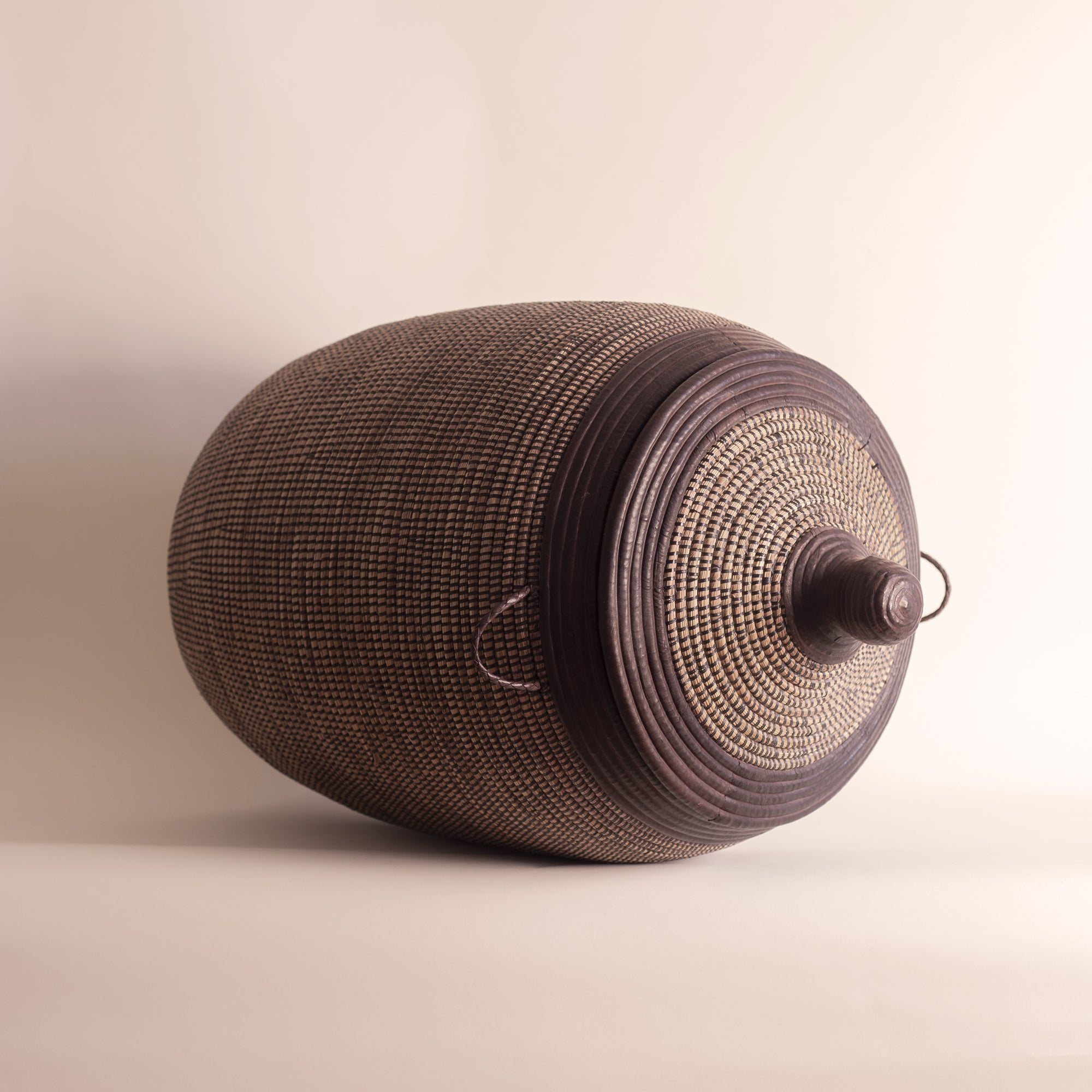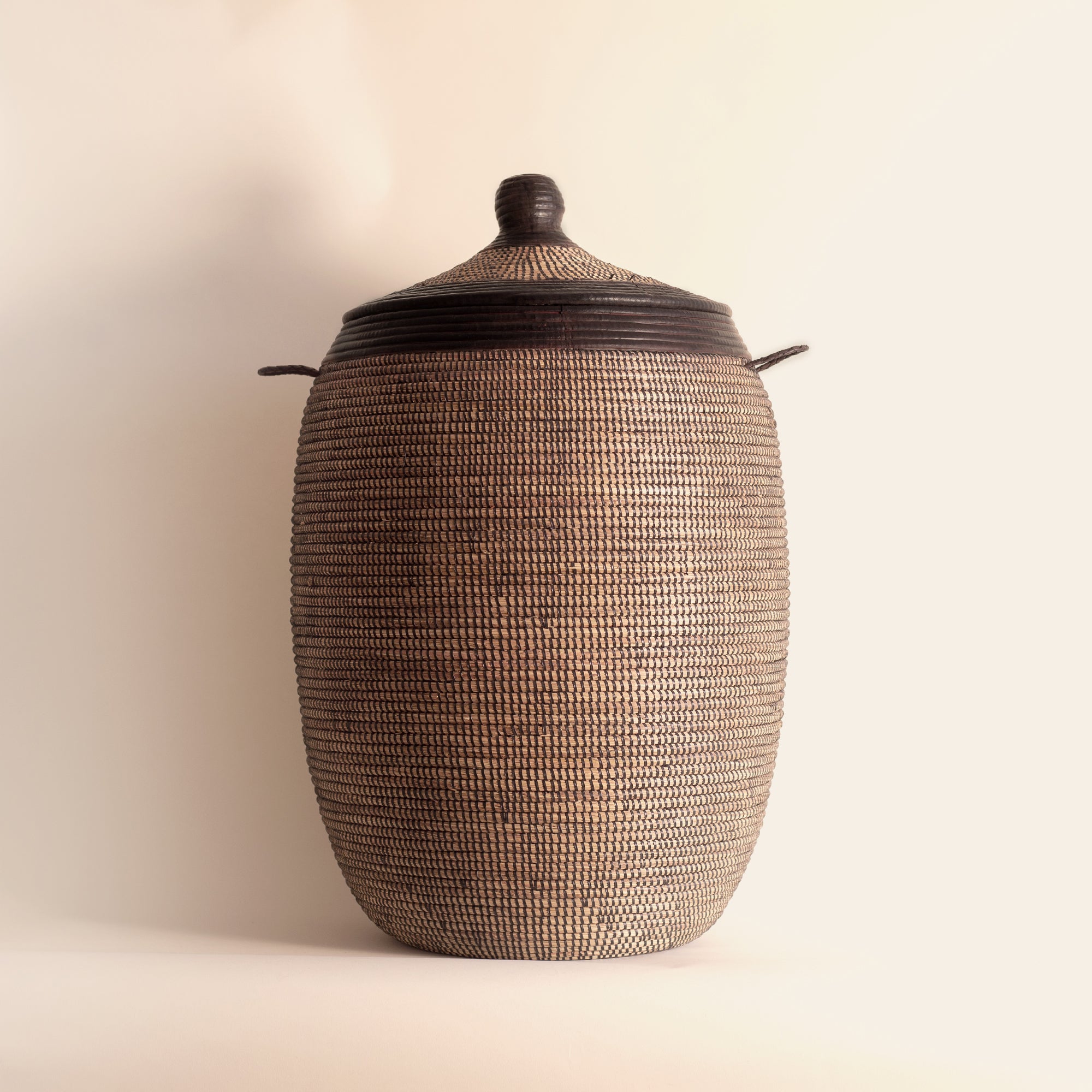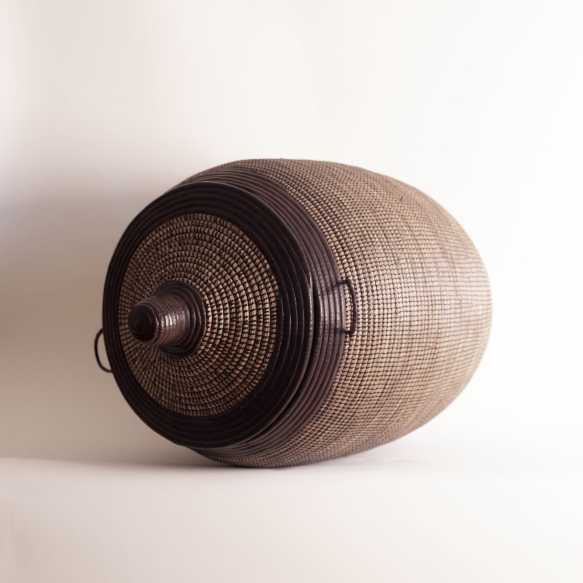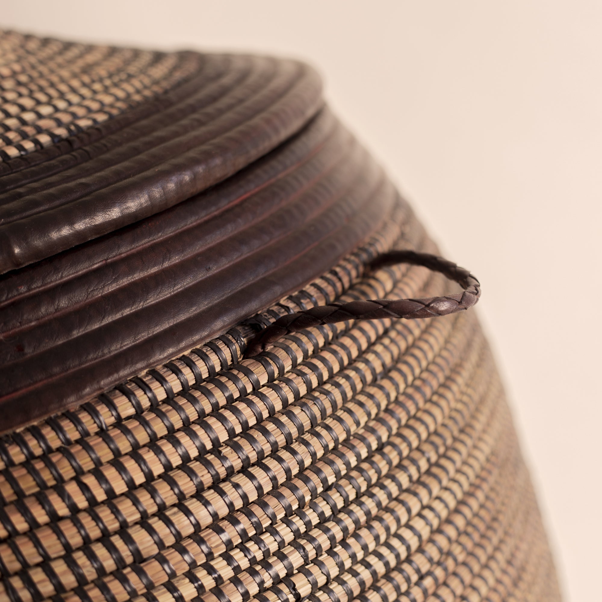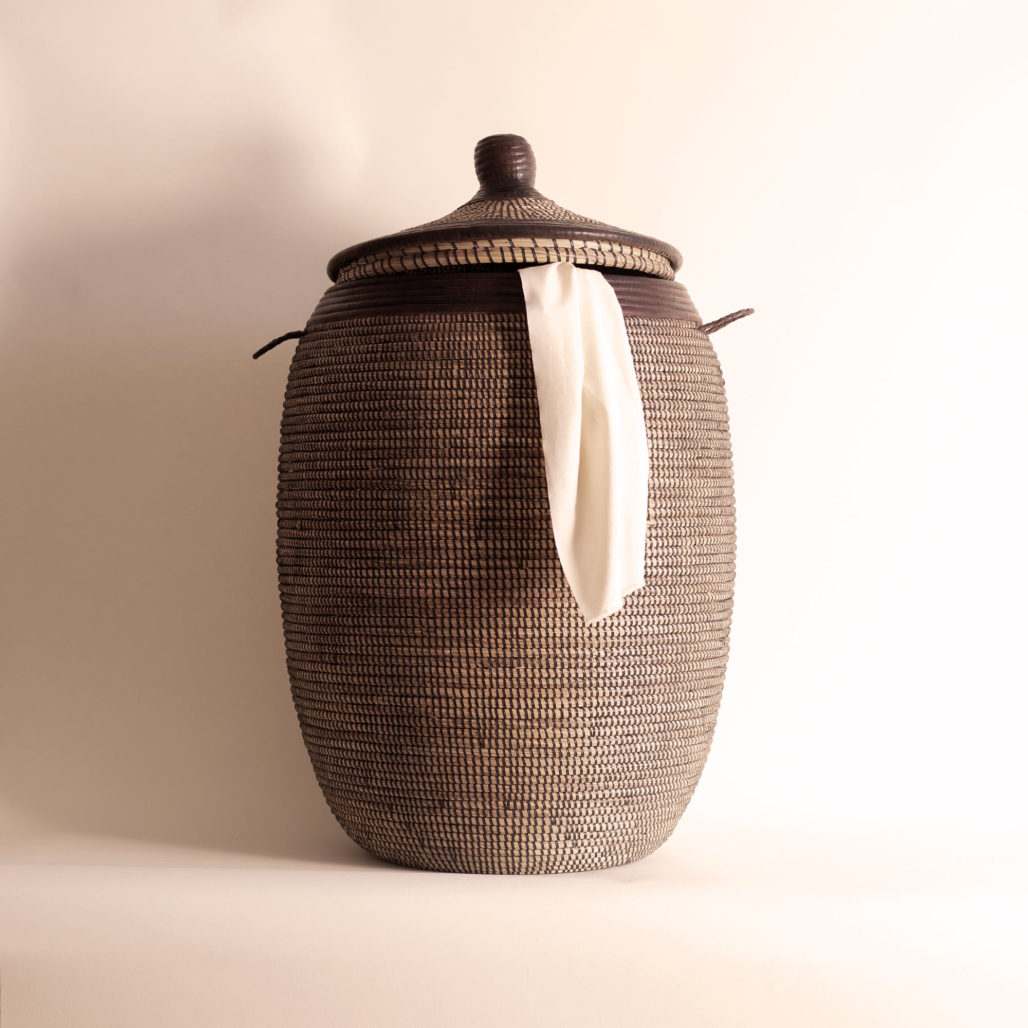 Laundry basket with lid, African woven basket - EGG Black Leather