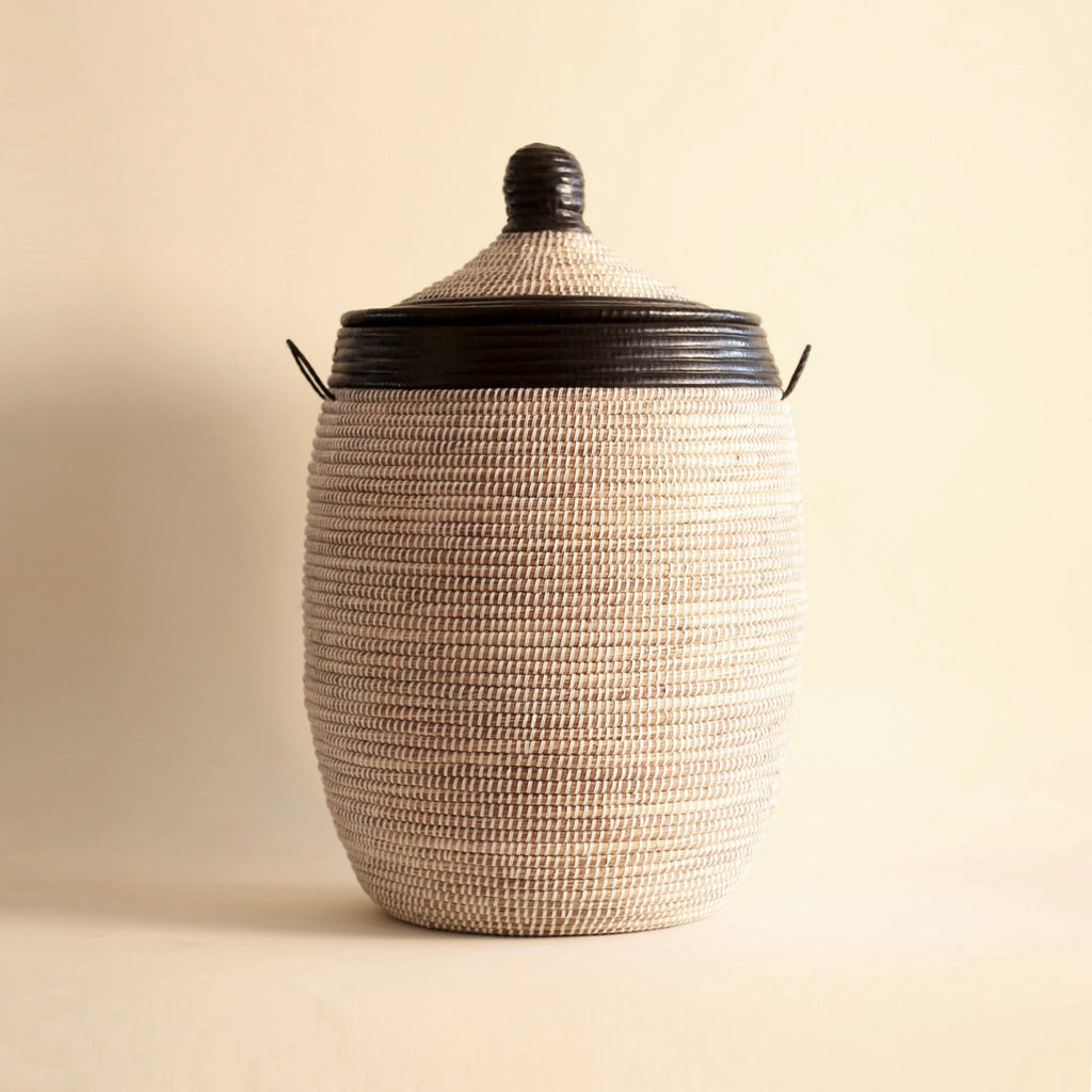 Wäschekorb mit Deckel, afrikanischer Flechtkorb - EGG Schwarz & Beige (Groß)