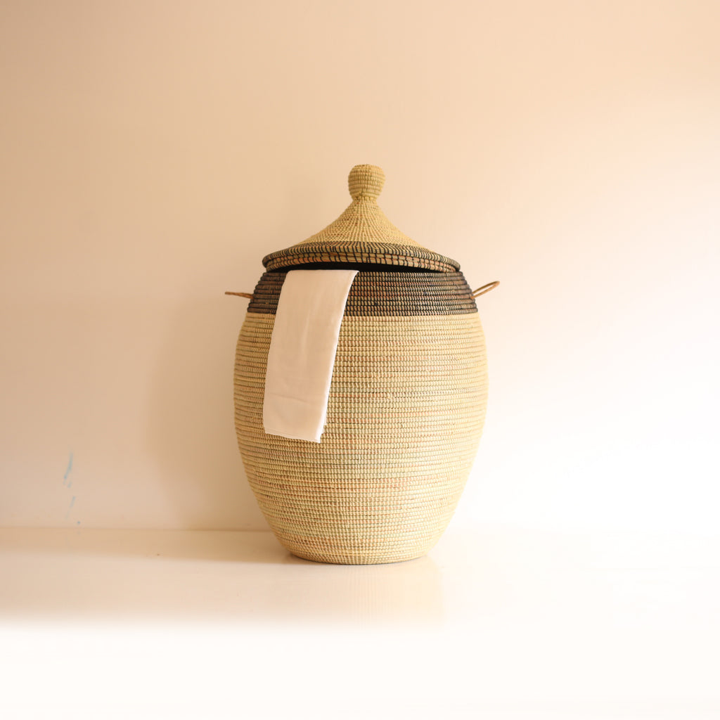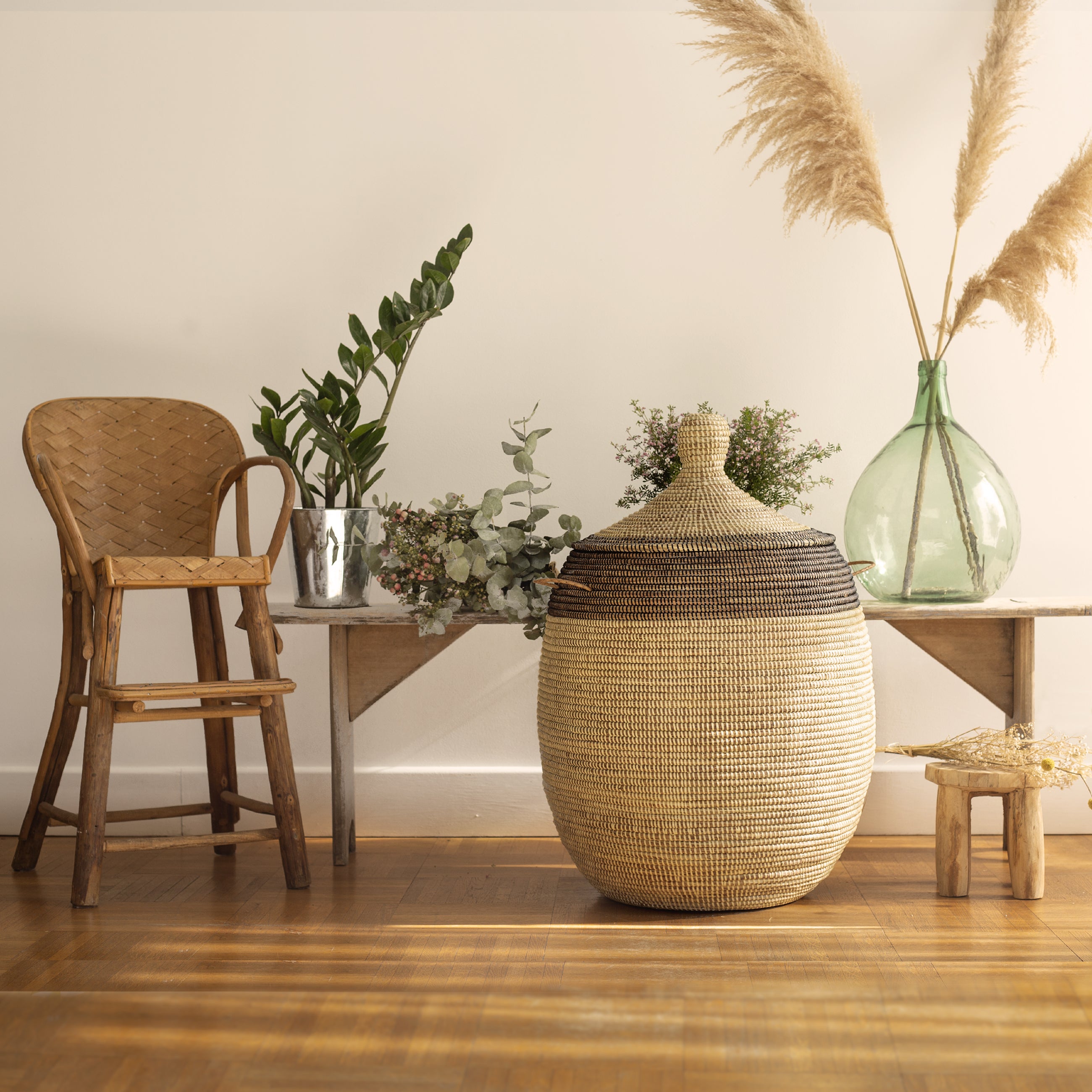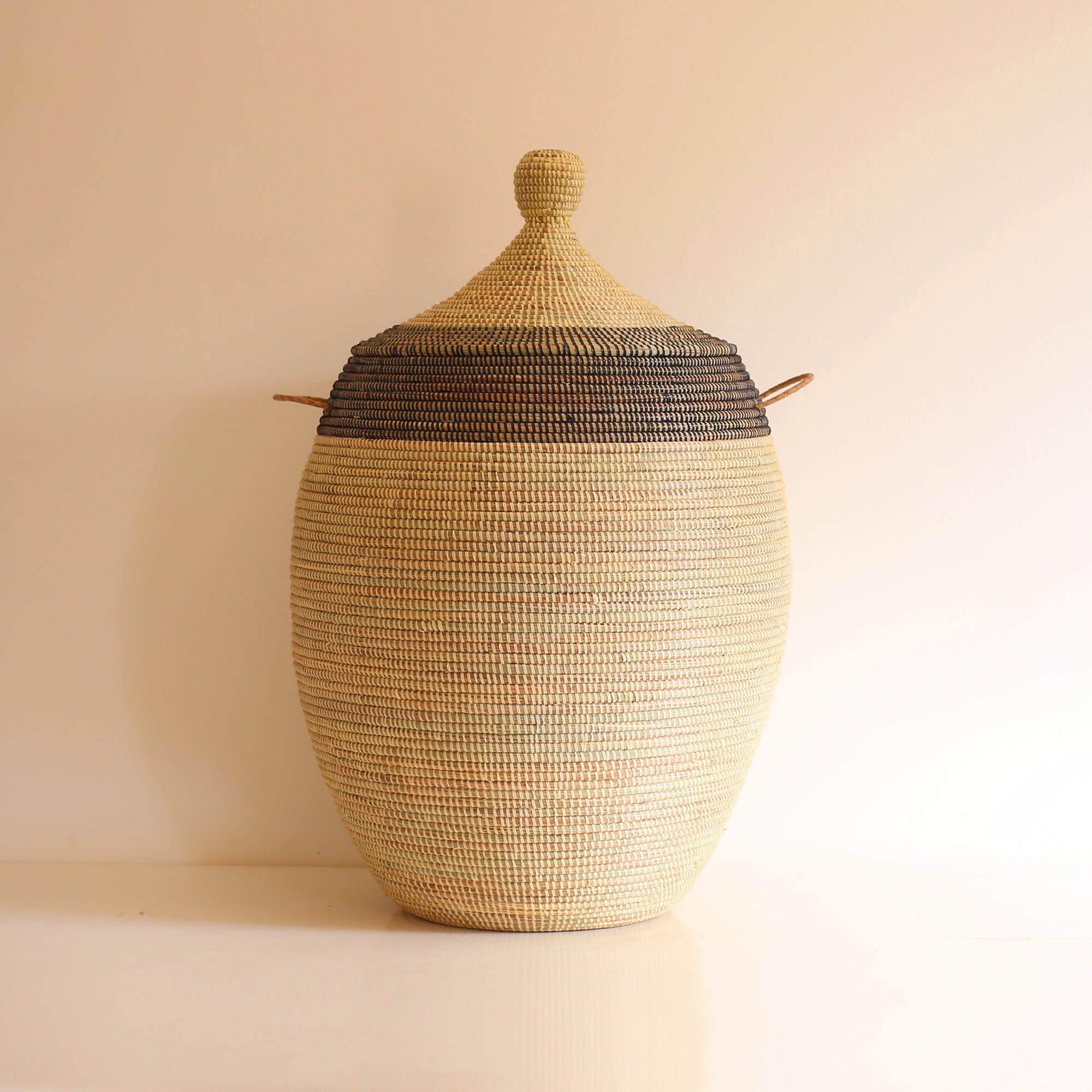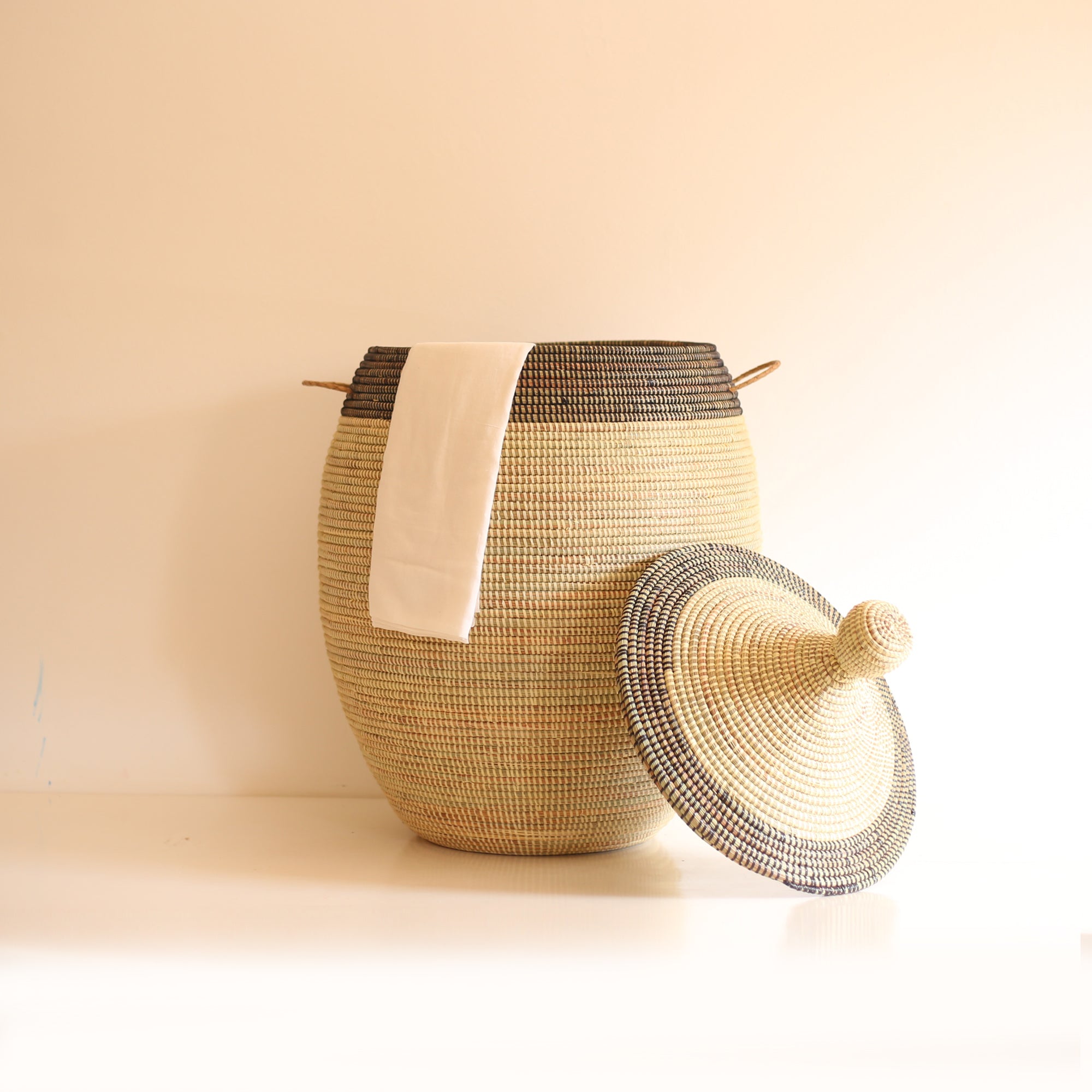 Wäschekorb mit Deckel, afrikanischer Flechtkorb - EGG Schwarz & Beige (Groß)