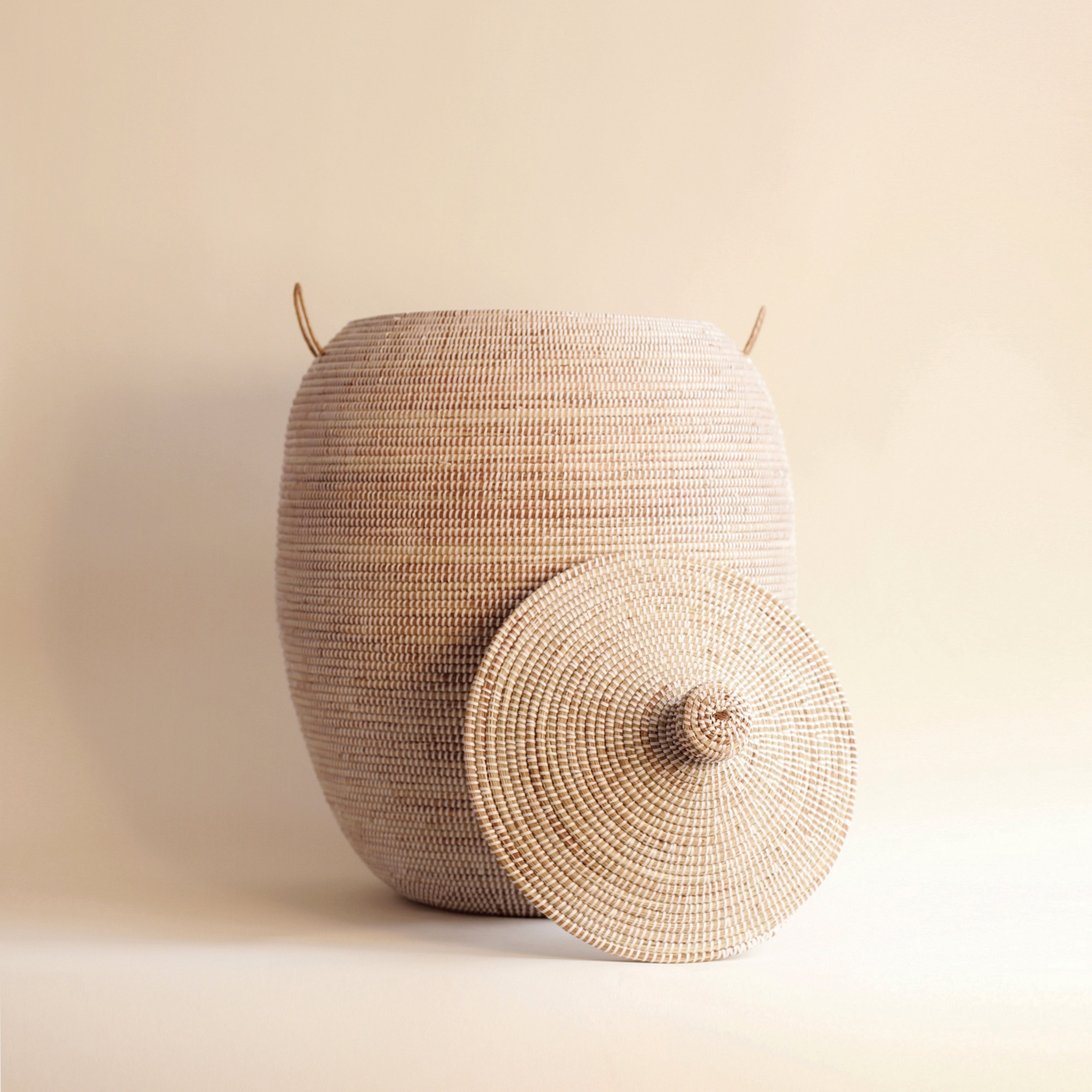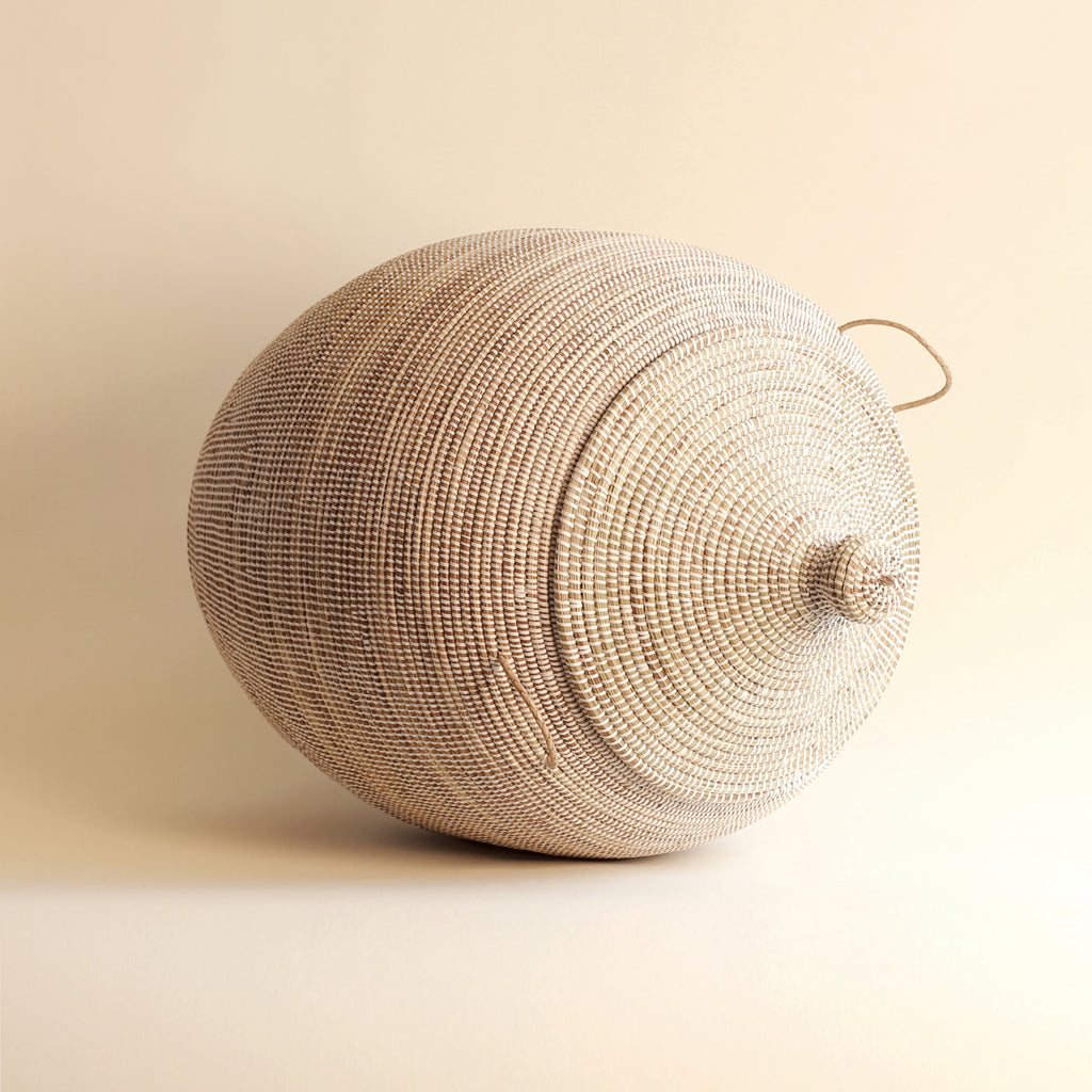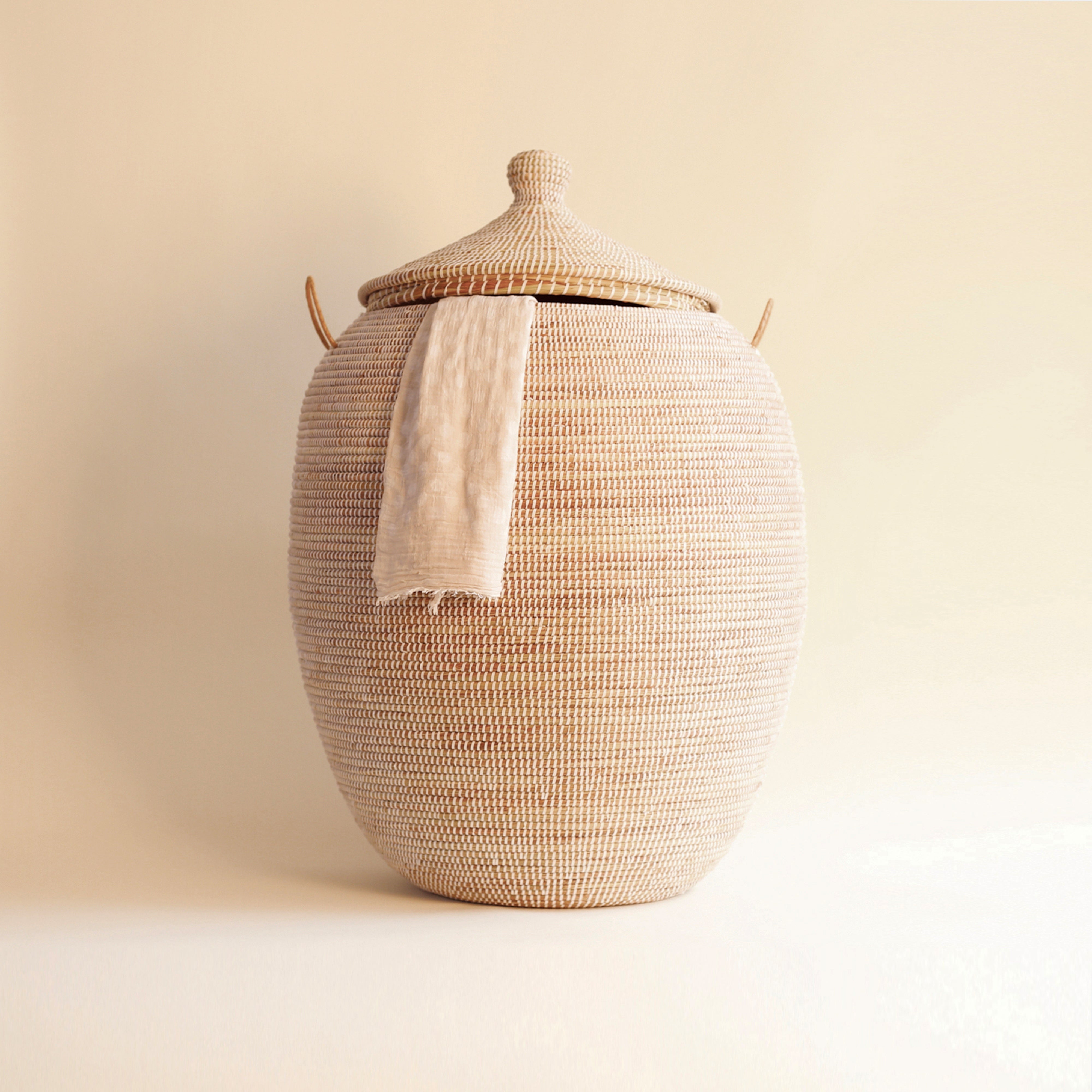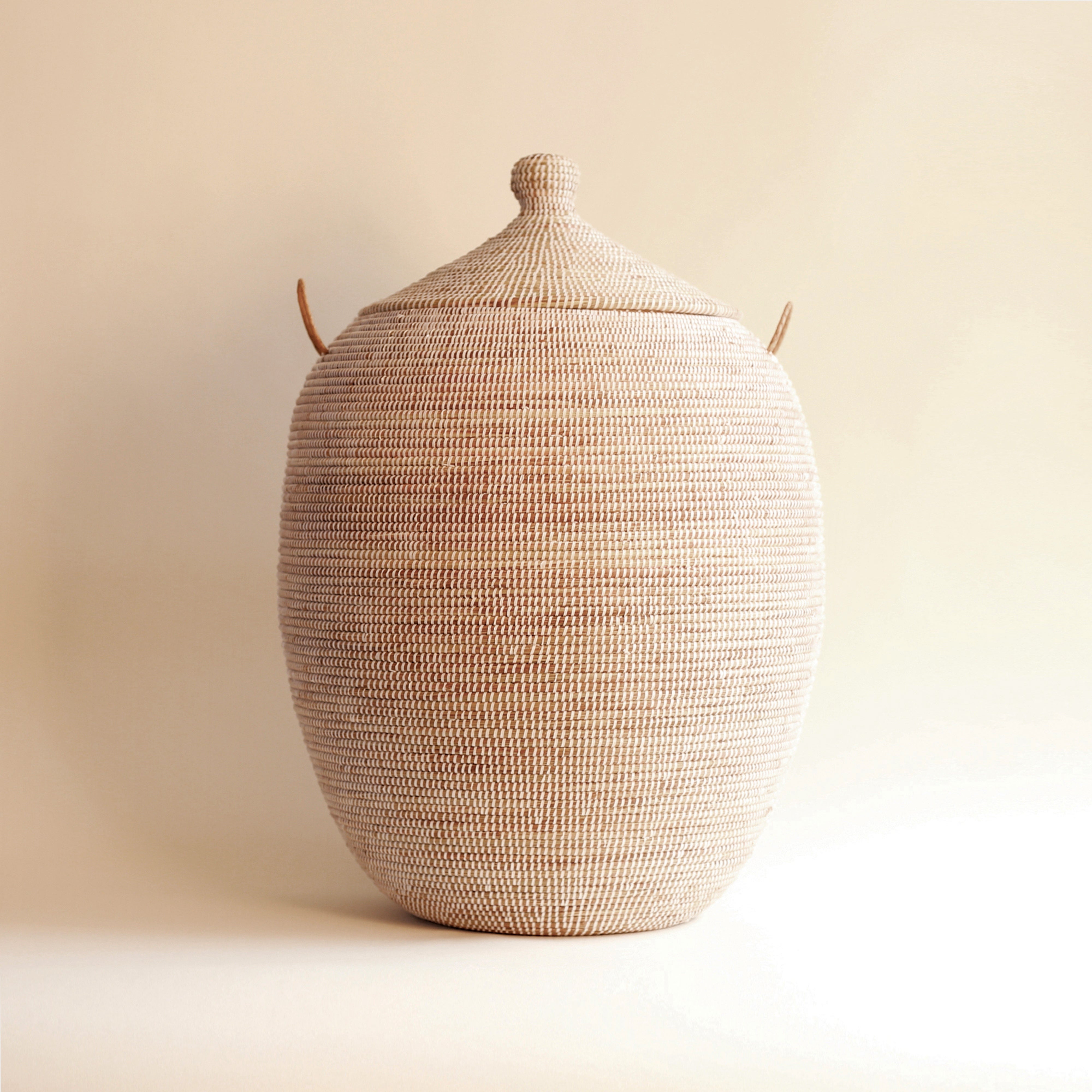 Wäschekorb mit Deckel, afrikanischer Flechtkorb - EIweiß (Groß)