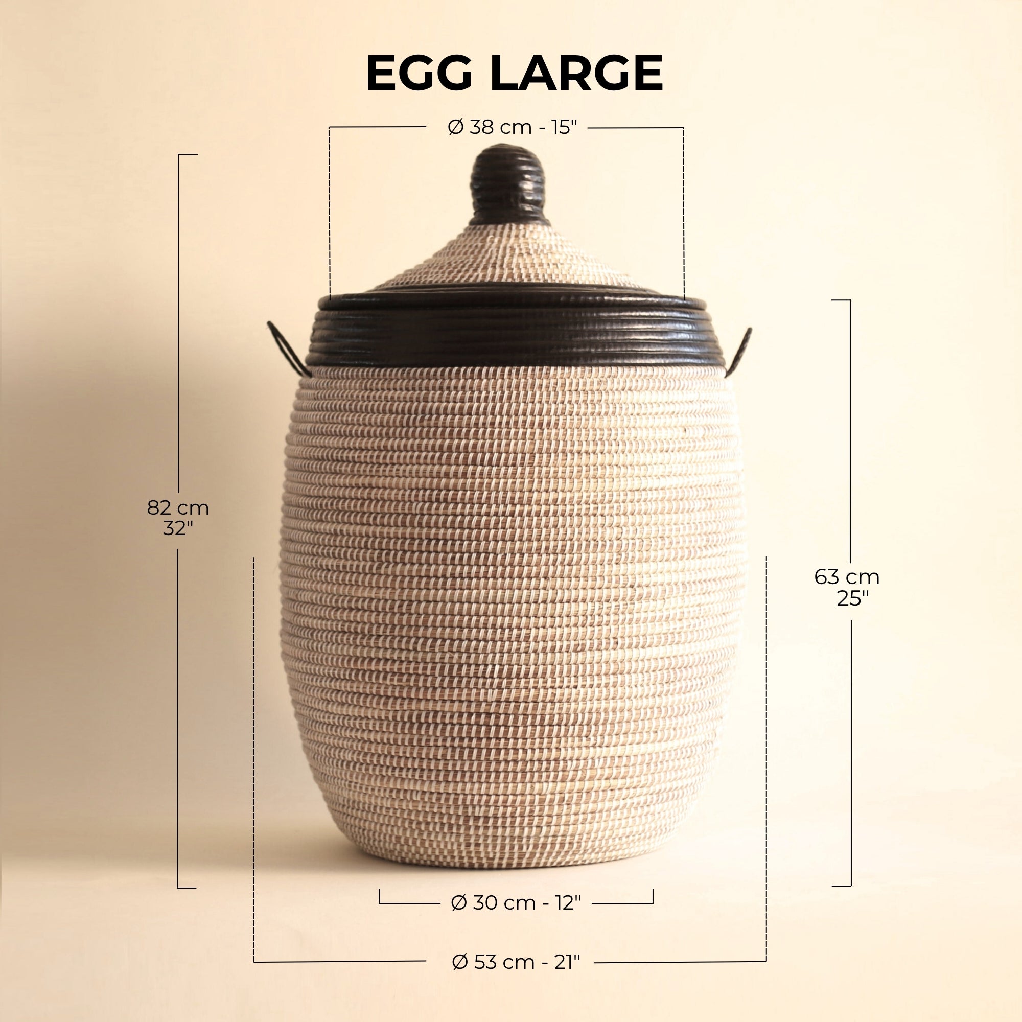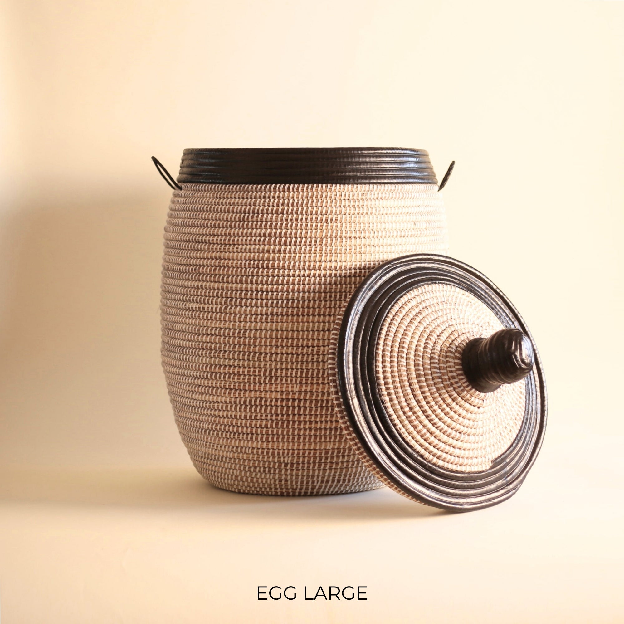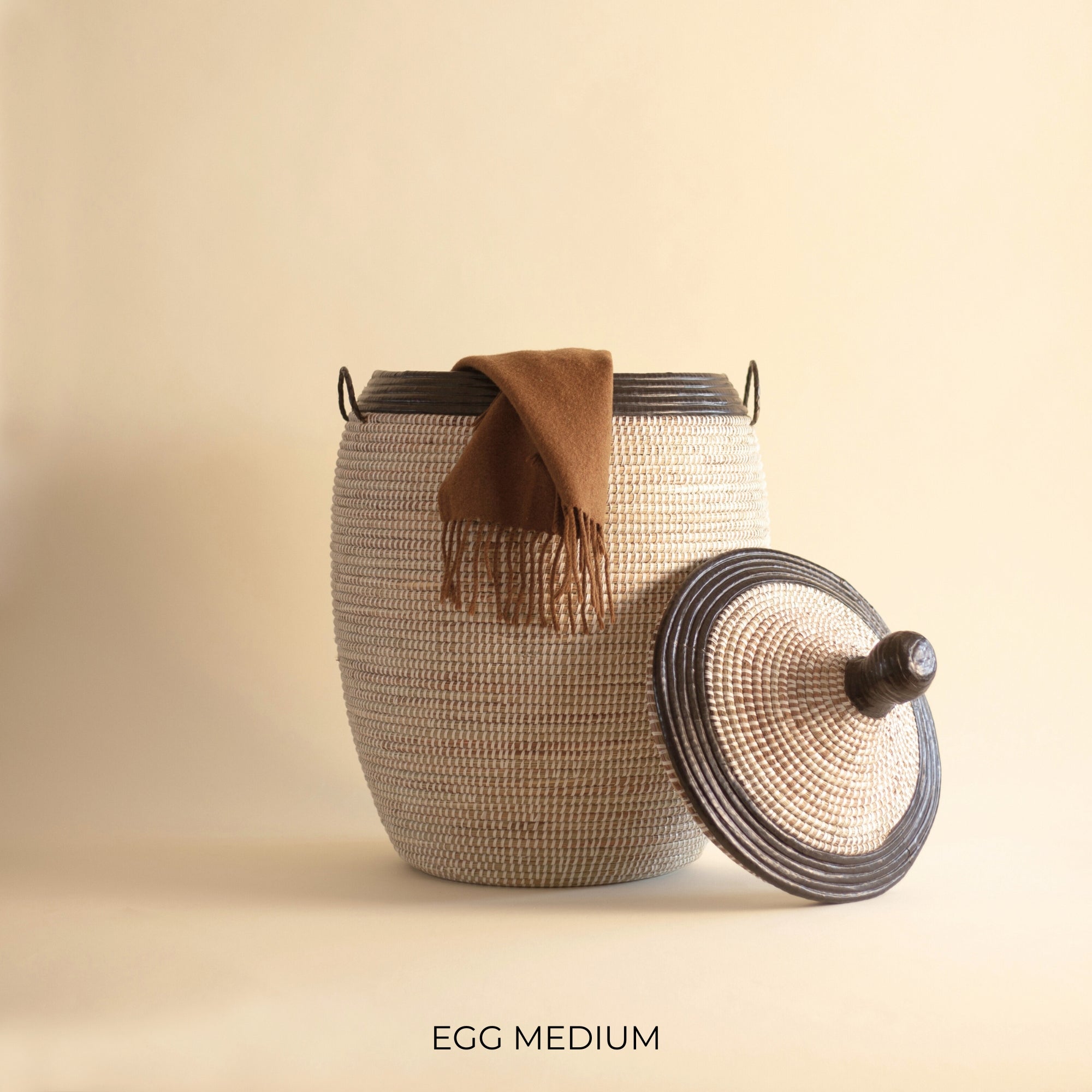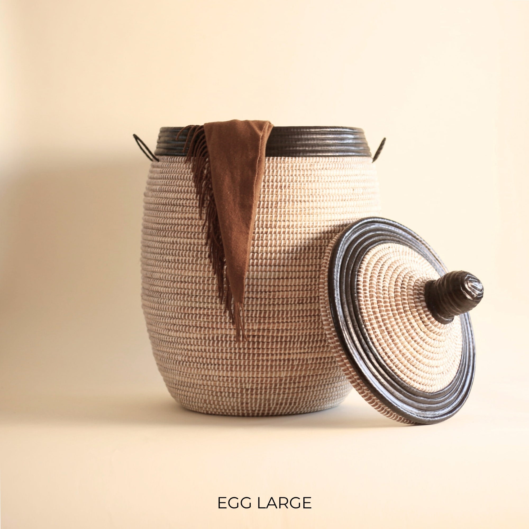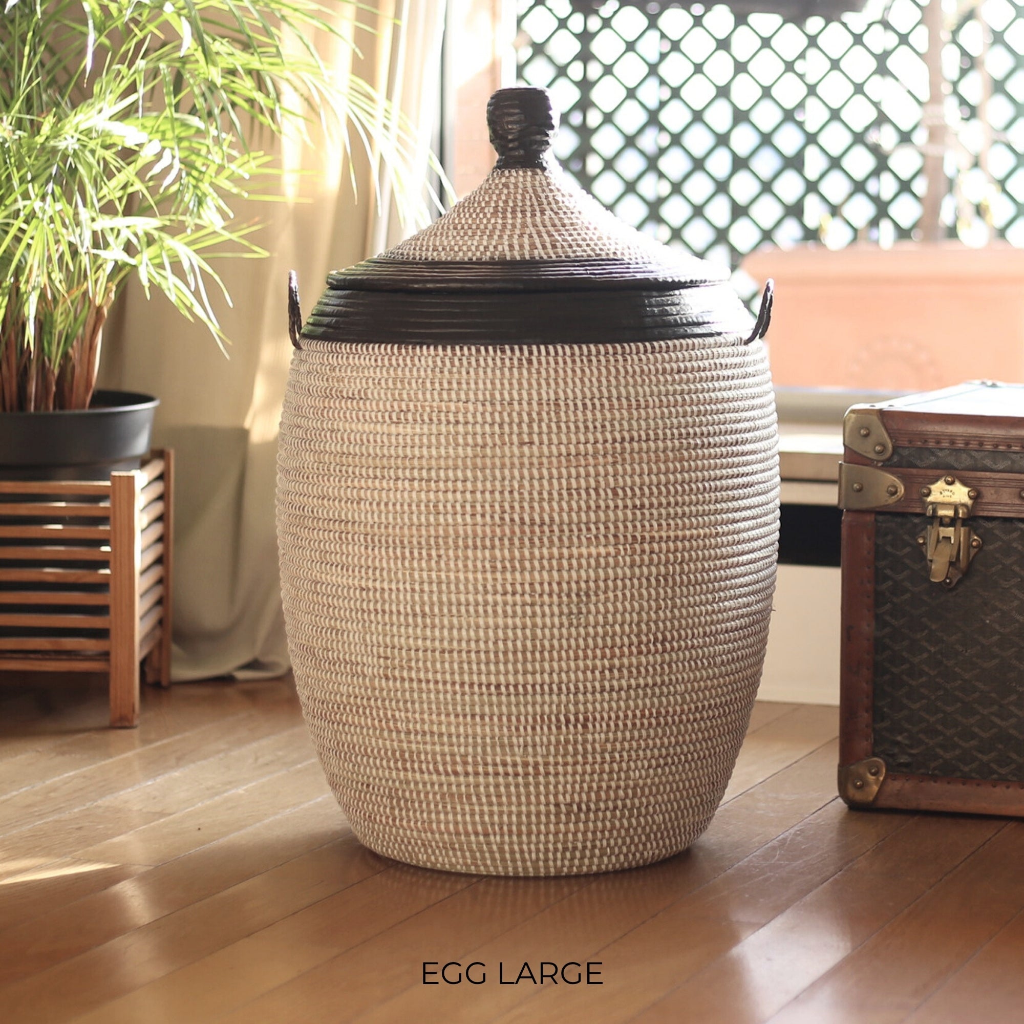 Wäschekorb mit Deckel, afrikanischer Flechtkorb – EI, weißes Leder (groß)