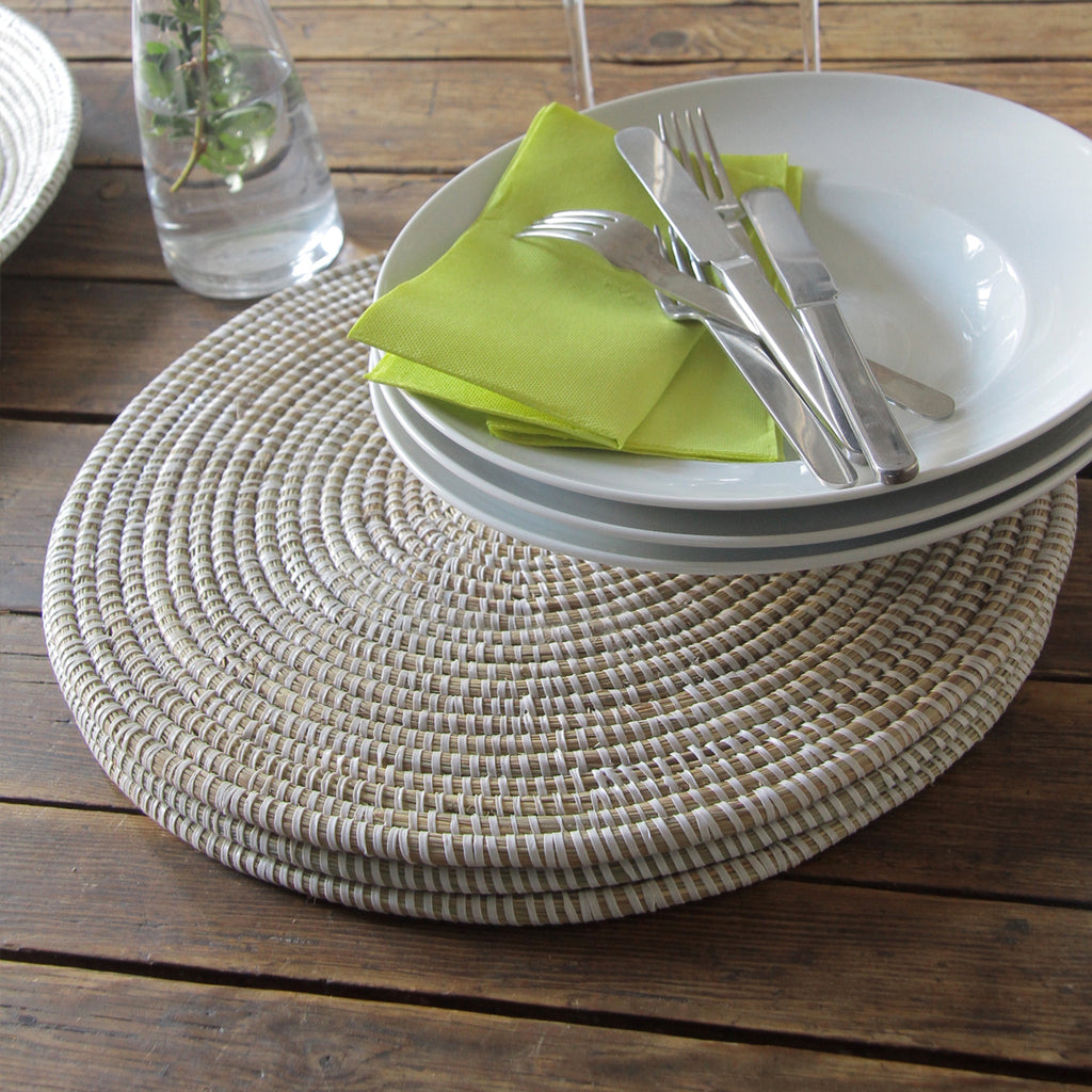 Verschönern Sie Ihr kulinarisches Erlebnis mit unseren handgewebten Tischsets, erhältlich in elegantem Schwarz oder Weiß. Diese runden Tischsets werden von Kunsthandwerkern im Senegal mit traditionellen Webtechniken gefertigt und verleihen Ihrem Tisch eine natürliche, minimalistische Note. Ob Sie eine Dinnerparty veranstalten oder ein gemütliches Familienessen genießen, diese schlichten und doch eleganten Tischsets verleihen jedem Ambiente ein stilvolles und authentisches Element.