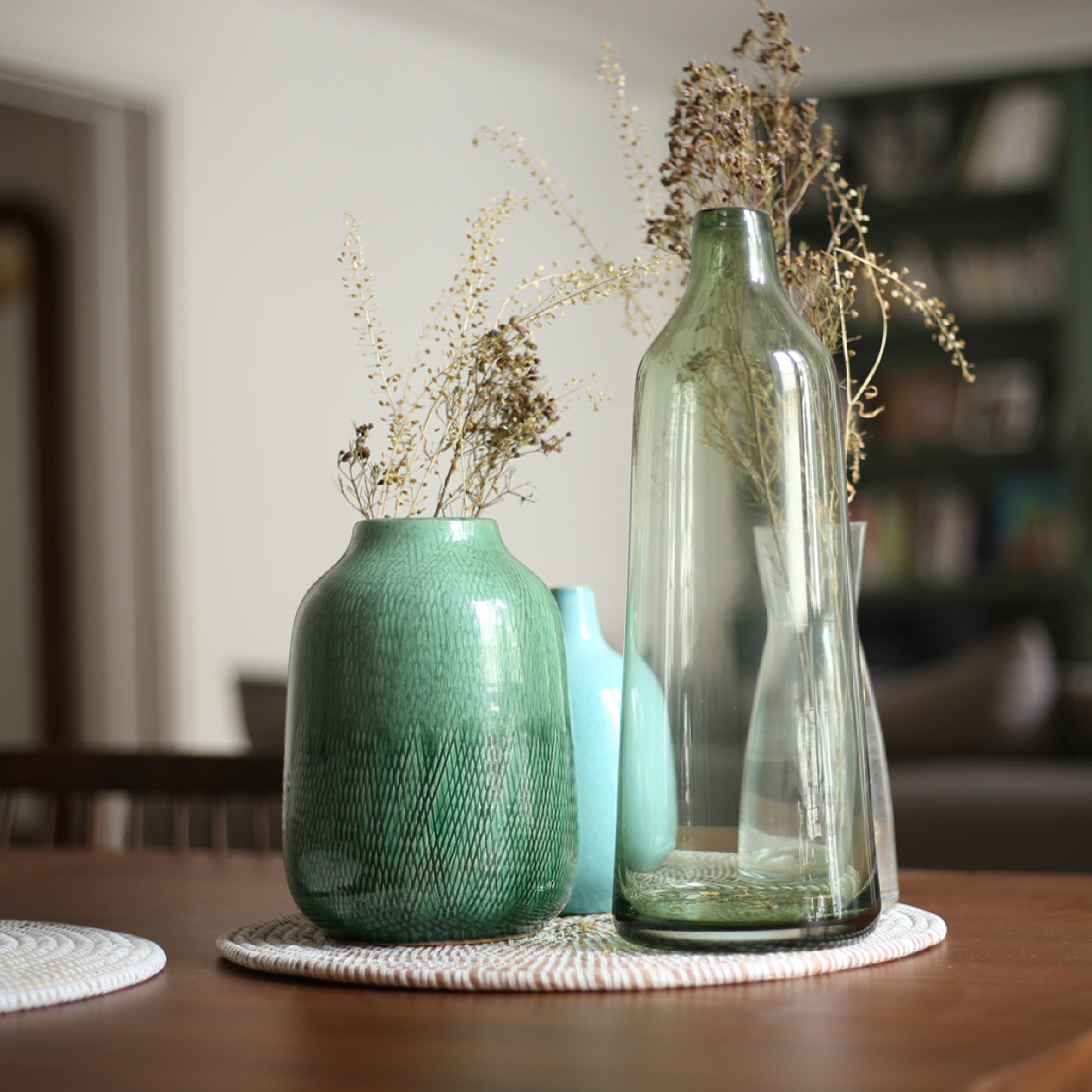 Hergestellt aus nachhaltigem Typha-Gras und verstärkt mit recycelten Kunststofffäden, sind diese Tischsets langlebig, umweltfreundlich und pflegeleicht. Nach Gebrauch einfach mit einem feuchten Tuch abwischen. Vermeiden Sie den Kontakt mit aggressiven Chemikalien, stehendem Wasser oder direkter Sonneneinstrahlung, um ihre Langlebigkeit zu erhalten.