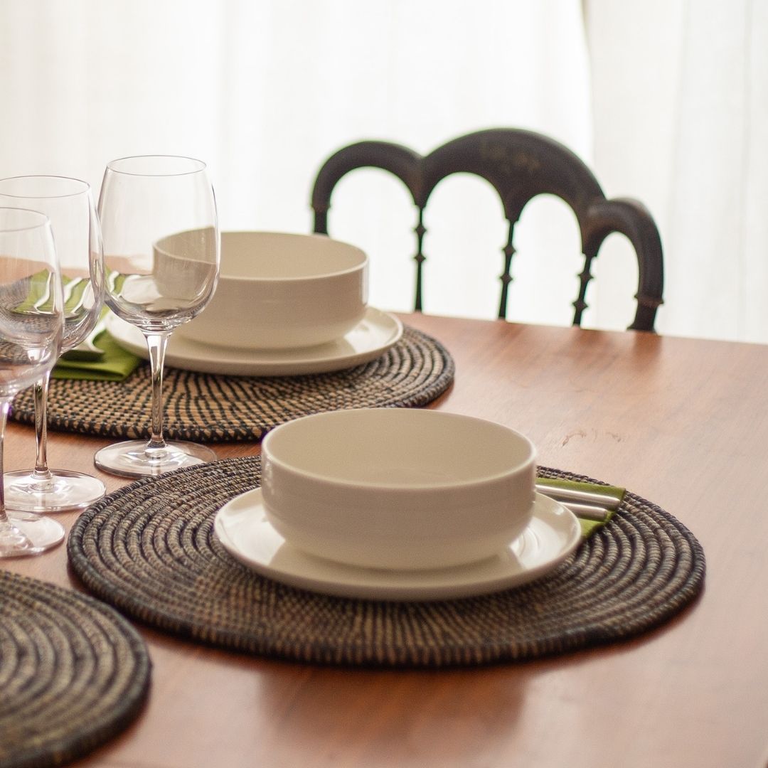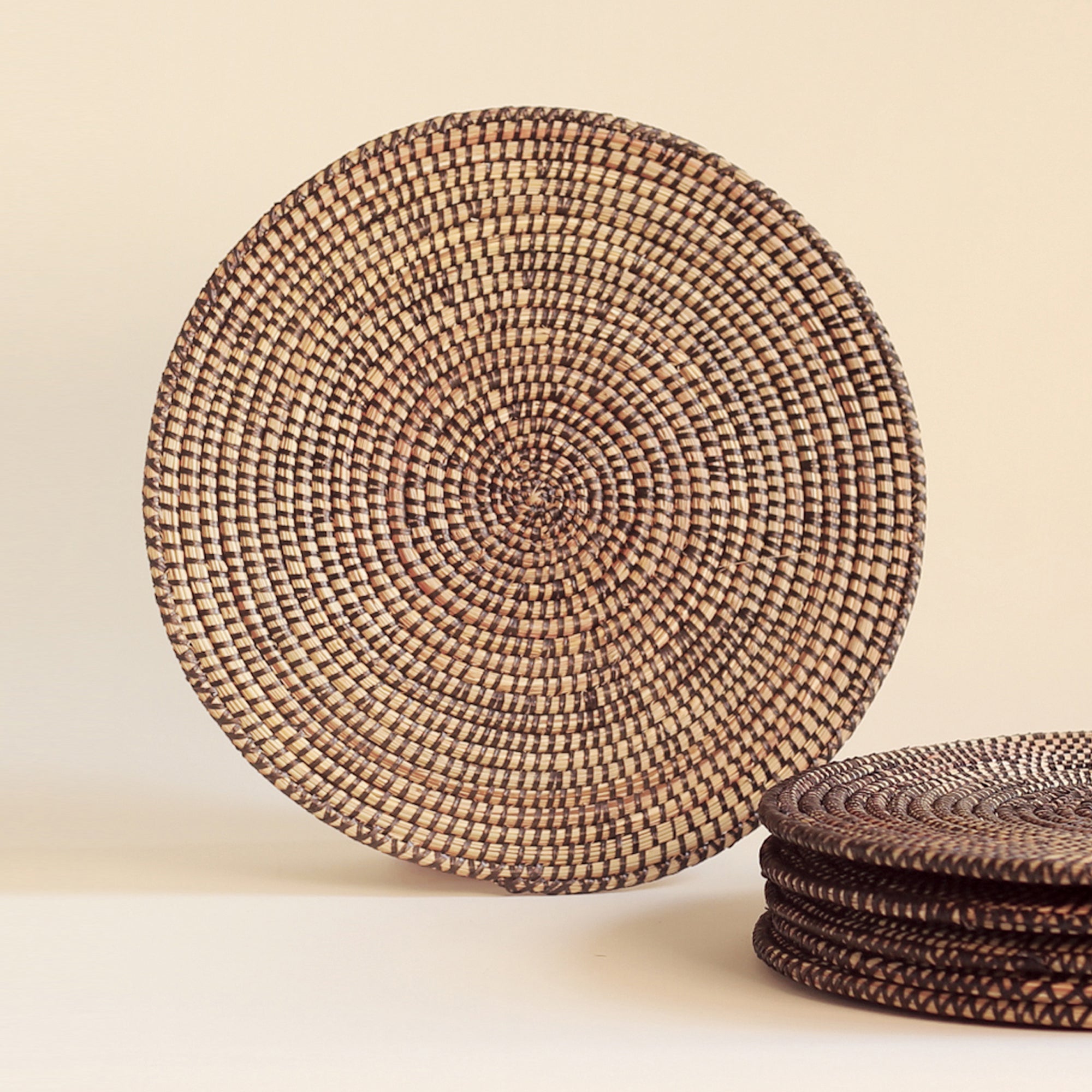 Verschönern Sie Ihr kulinarisches Erlebnis mit unseren handgewebten Tischsets, erhältlich in elegantem Schwarz oder Weiß. Diese runden Tischsets werden von Kunsthandwerkern im Senegal mit traditionellen Webtechniken gefertigt und verleihen Ihrem Tisch eine natürliche, minimalistische Note. Ob Sie eine Dinnerparty veranstalten oder ein gemütliches Familienessen genießen, diese schlichten und doch eleganten Tischsets verleihen jedem Ambiente ein stilvolles und authentisches Element.