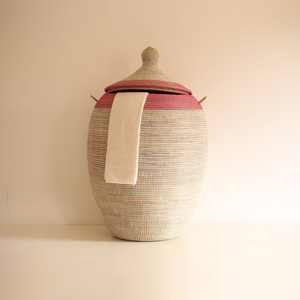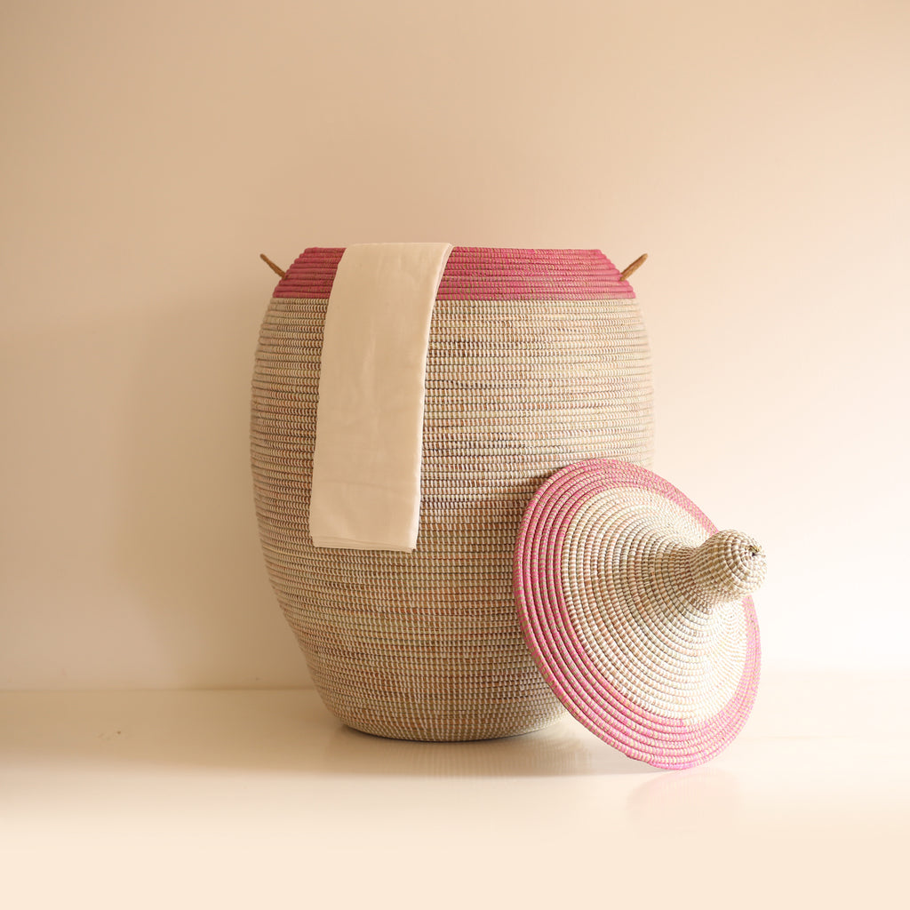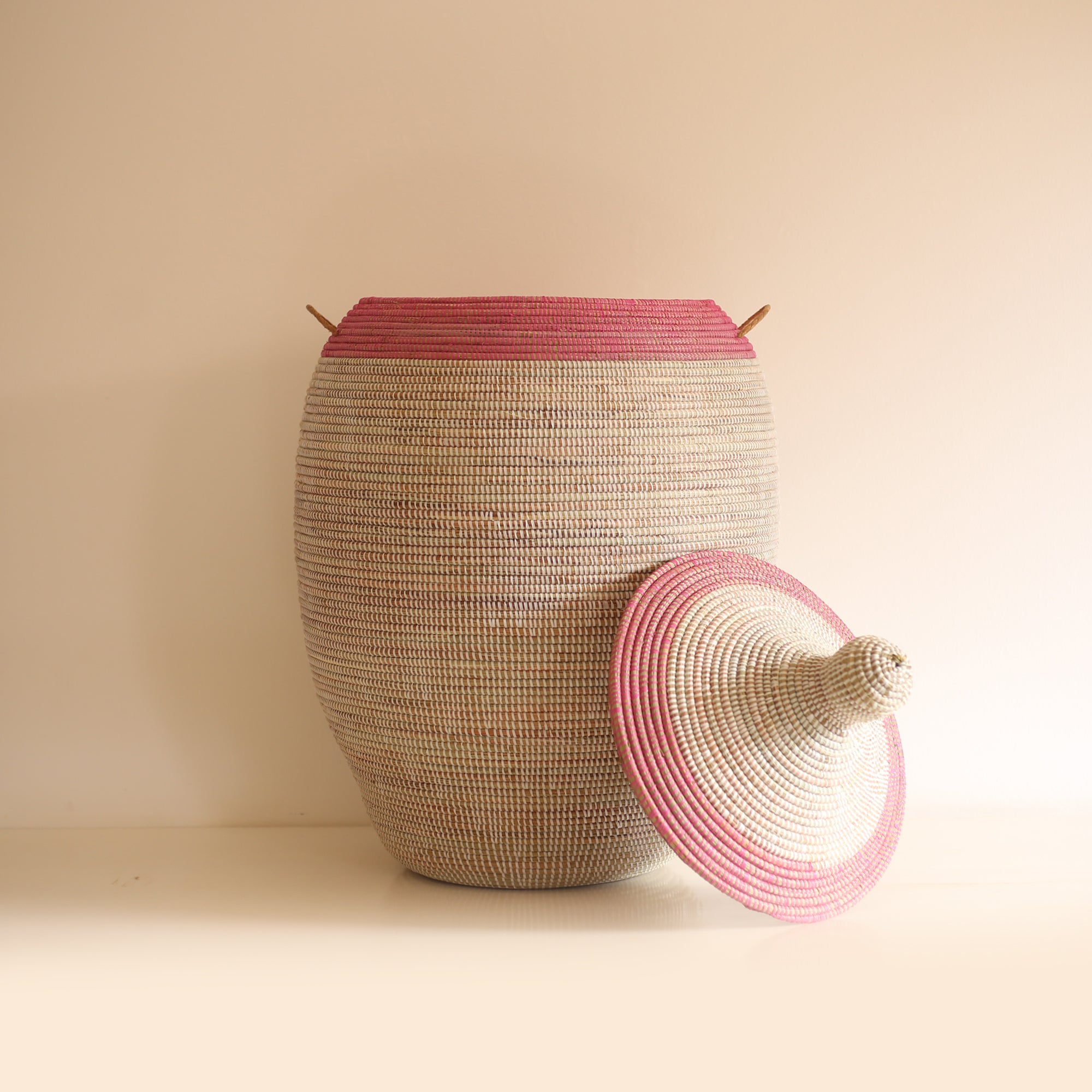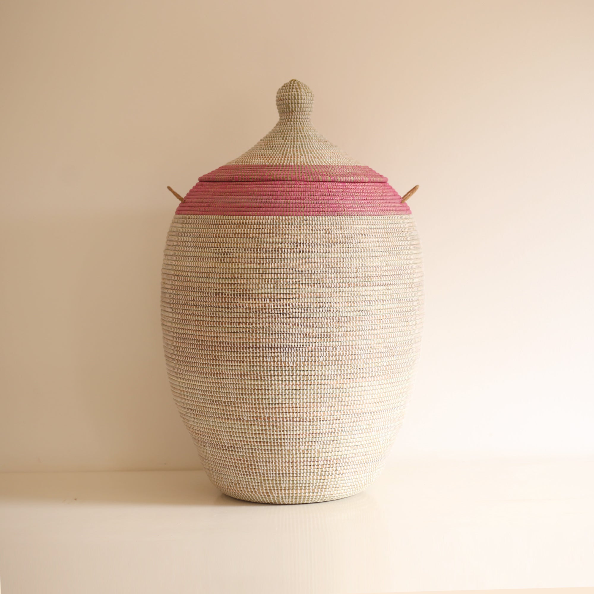 Wäschekorb mit Deckel, afrikanischer Flechtkorb - EGG Pink & White (Groß)