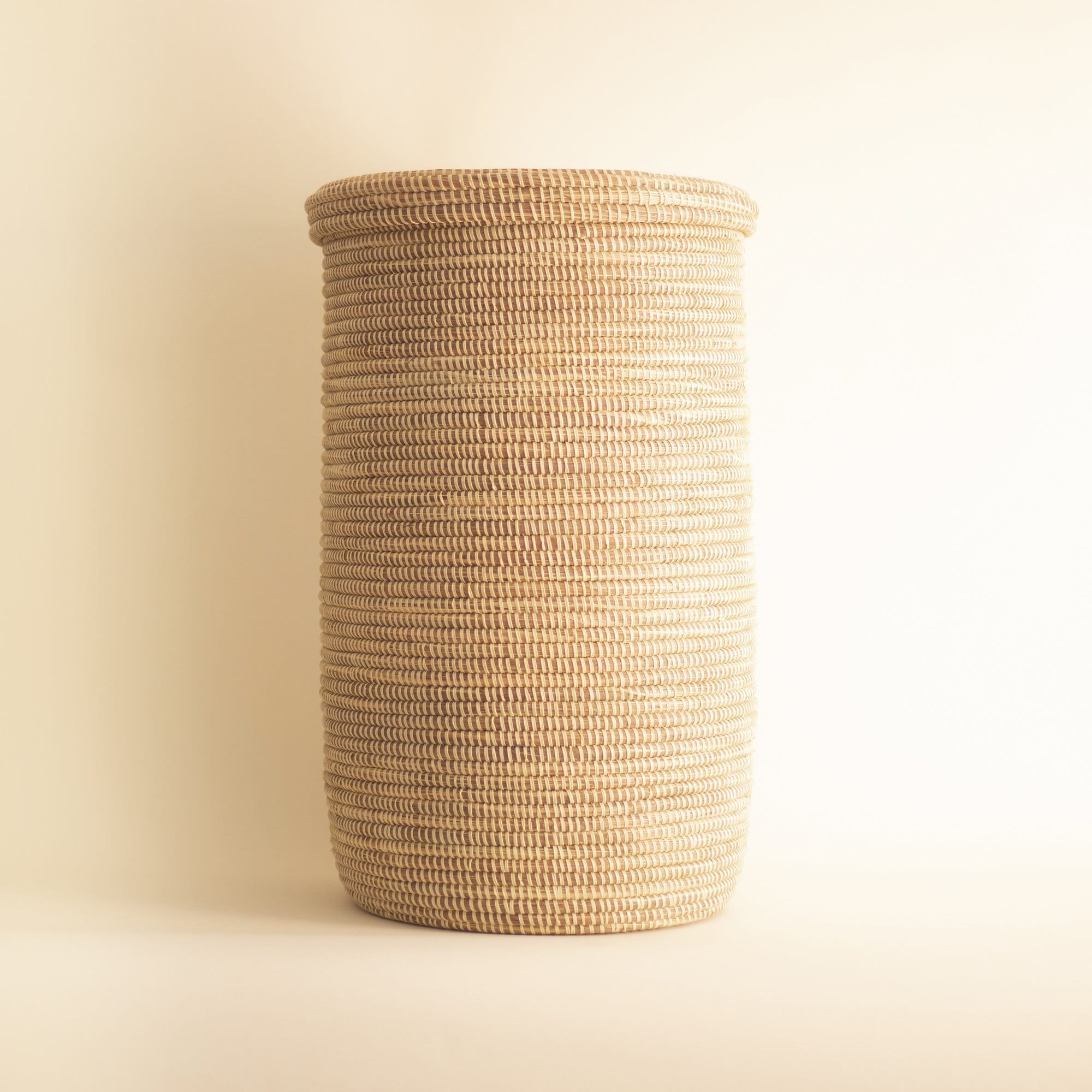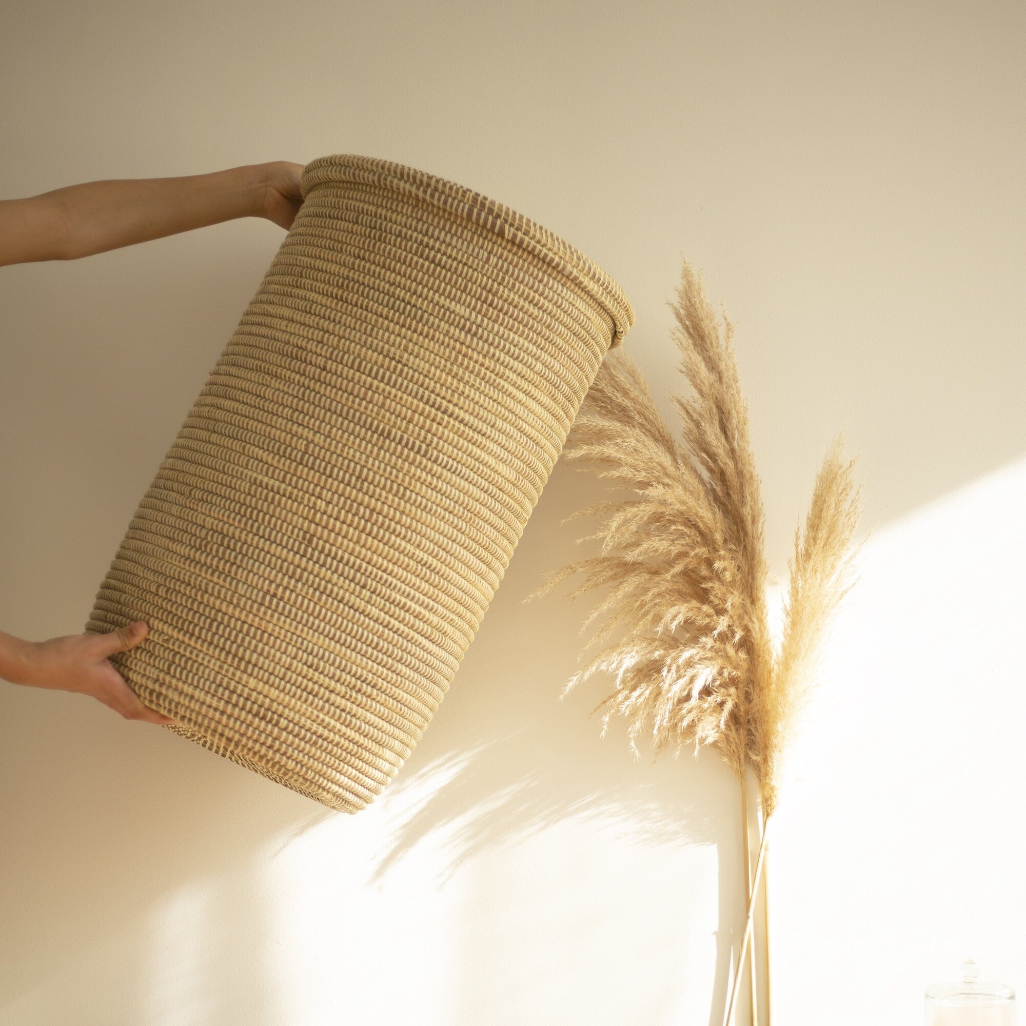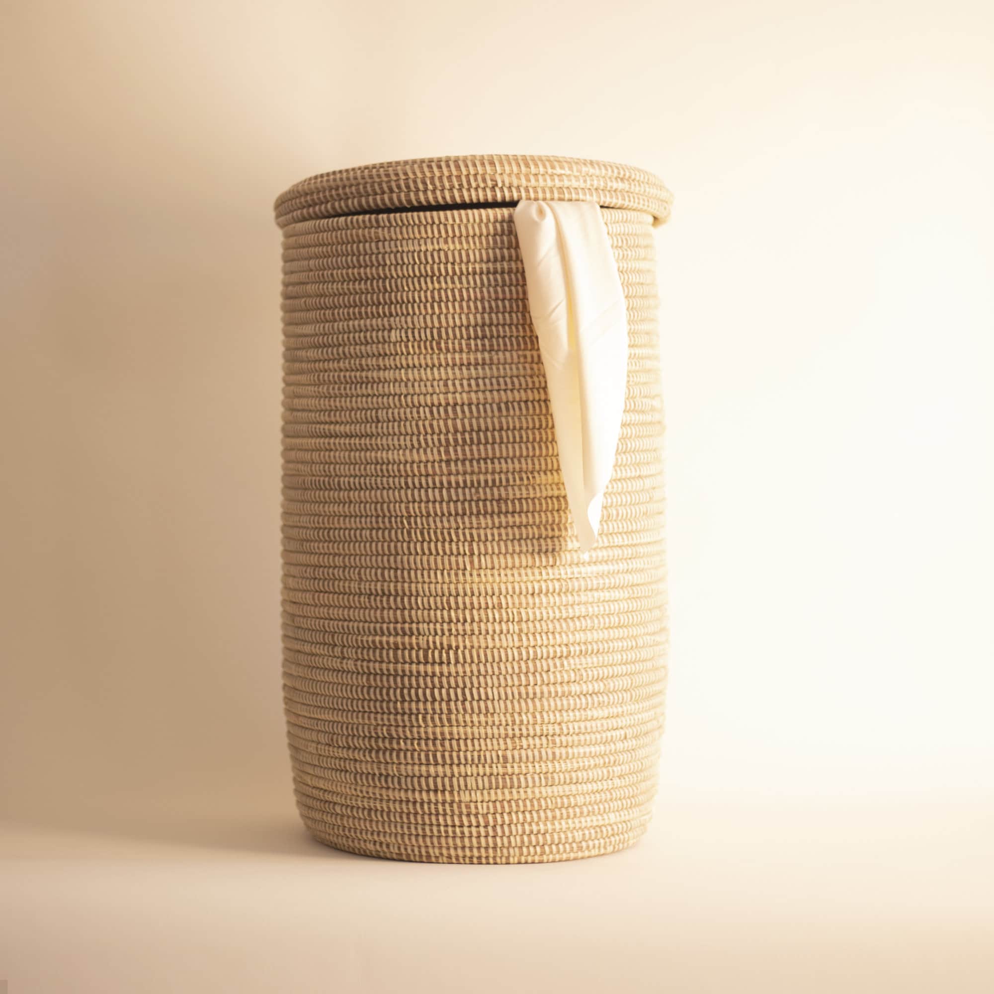 Afrikanischer gewebter Korb, Wäschekorb, natürlicher Boho-Seegraskorb mit Deckel – YOGA Beige (groß)