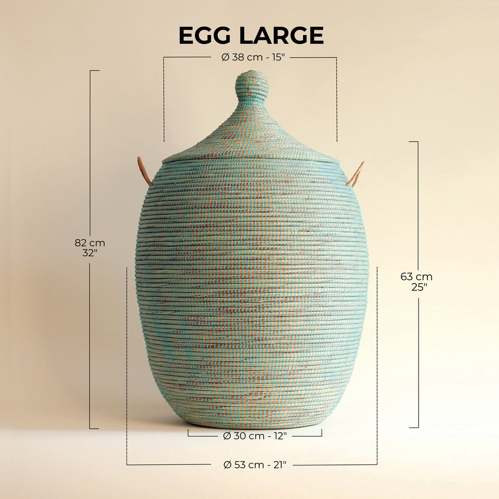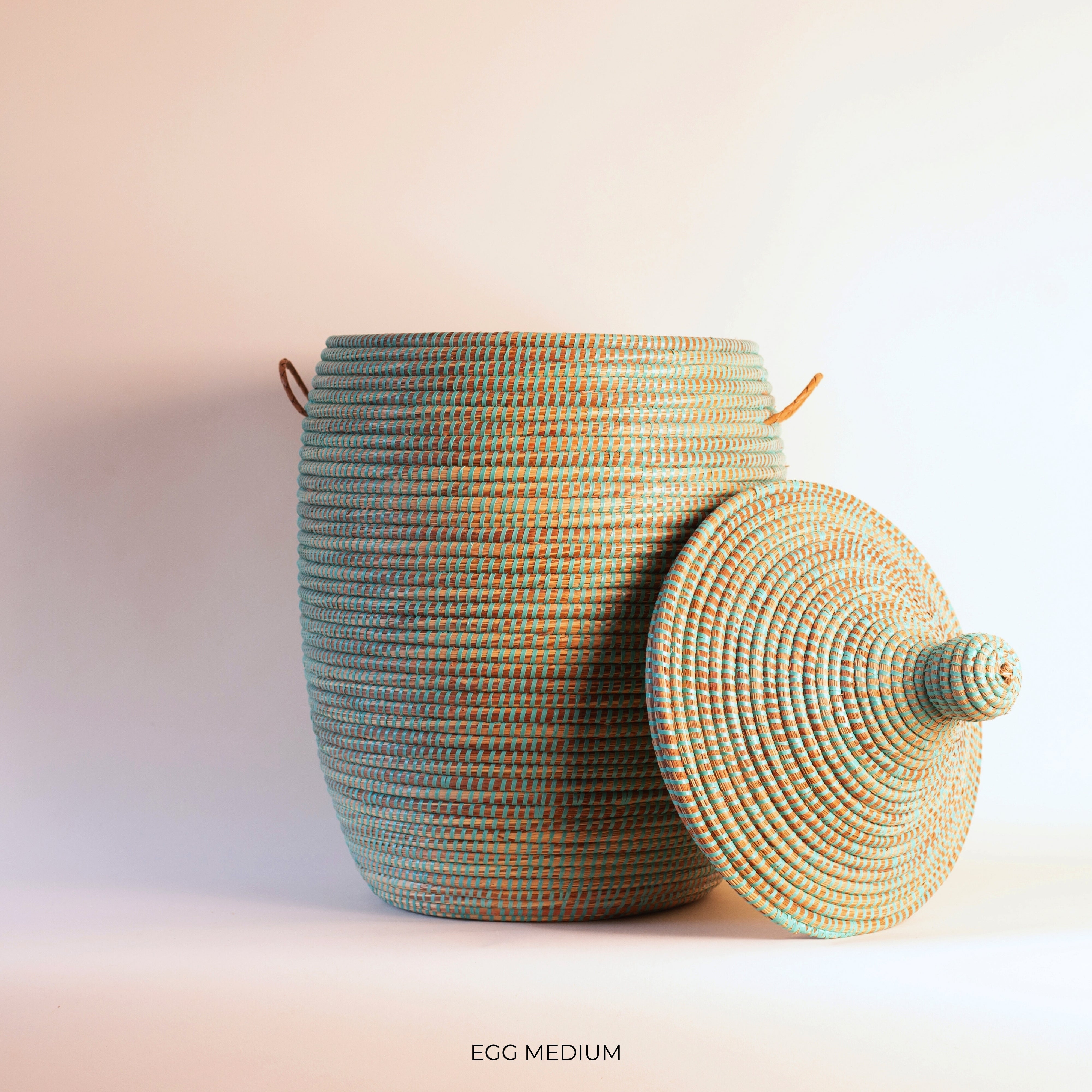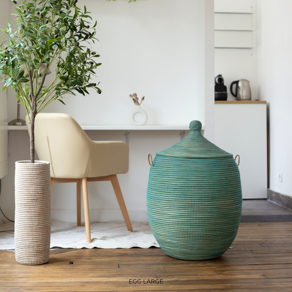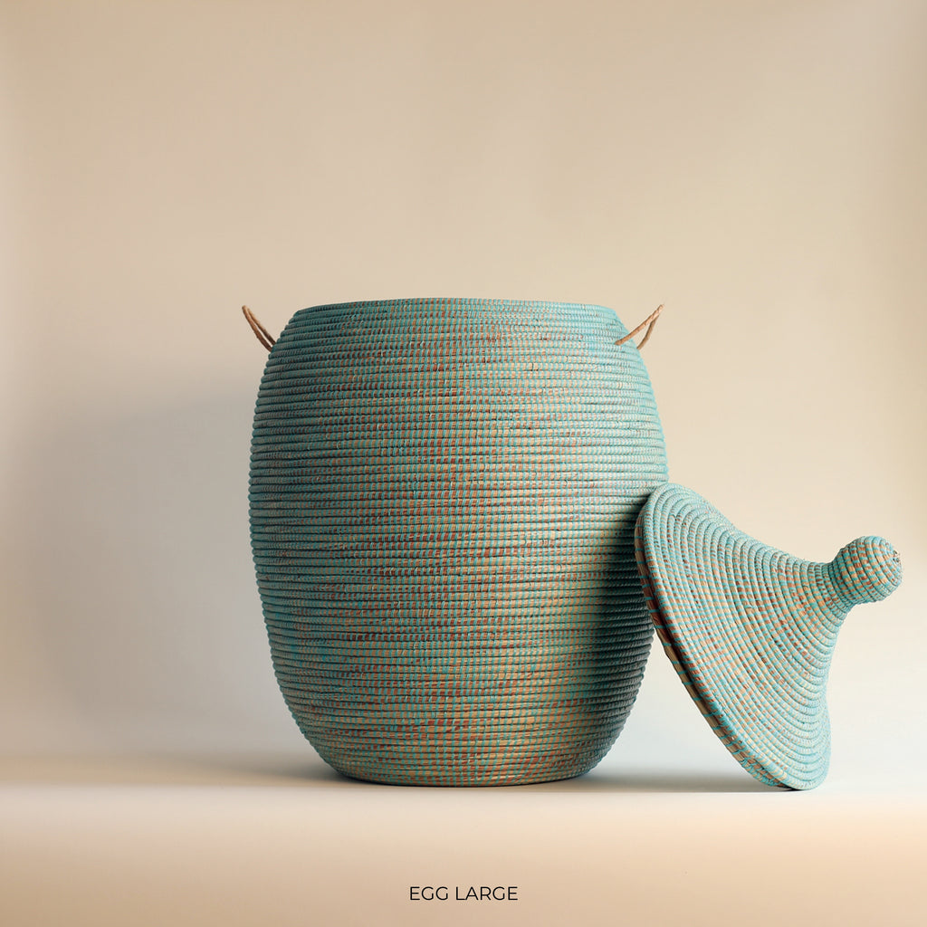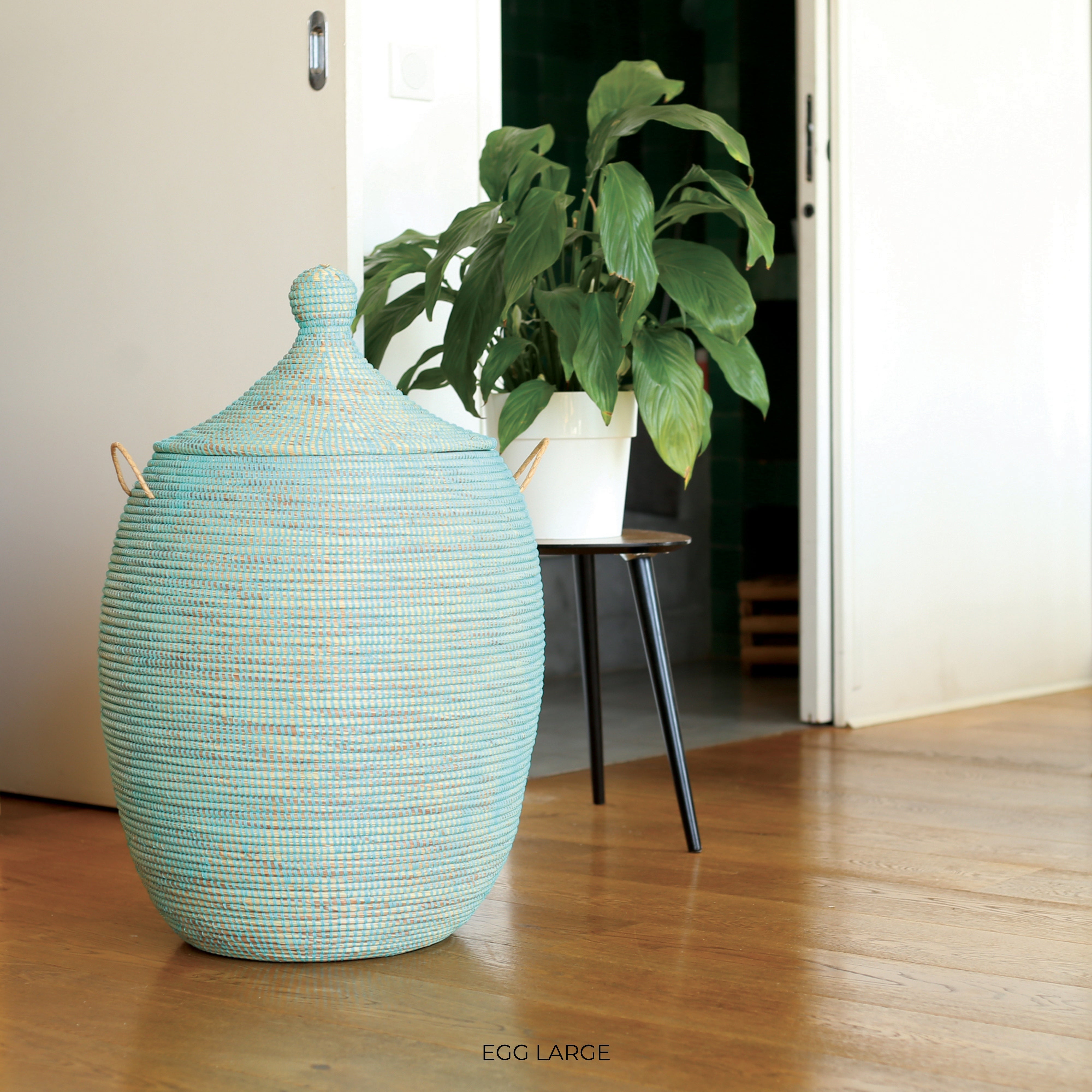 Practical and easy to carry, they come with leather handles and close with a fitted lid. You can use them to store laundry, toys, pillows, blankets, or any unsightly objects. Having good storage and organization in the home brings us serenity. The EGG baskets help eliminate clutter while brightening your decor with a beautiful, unique piece.