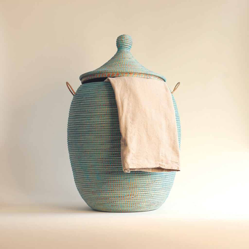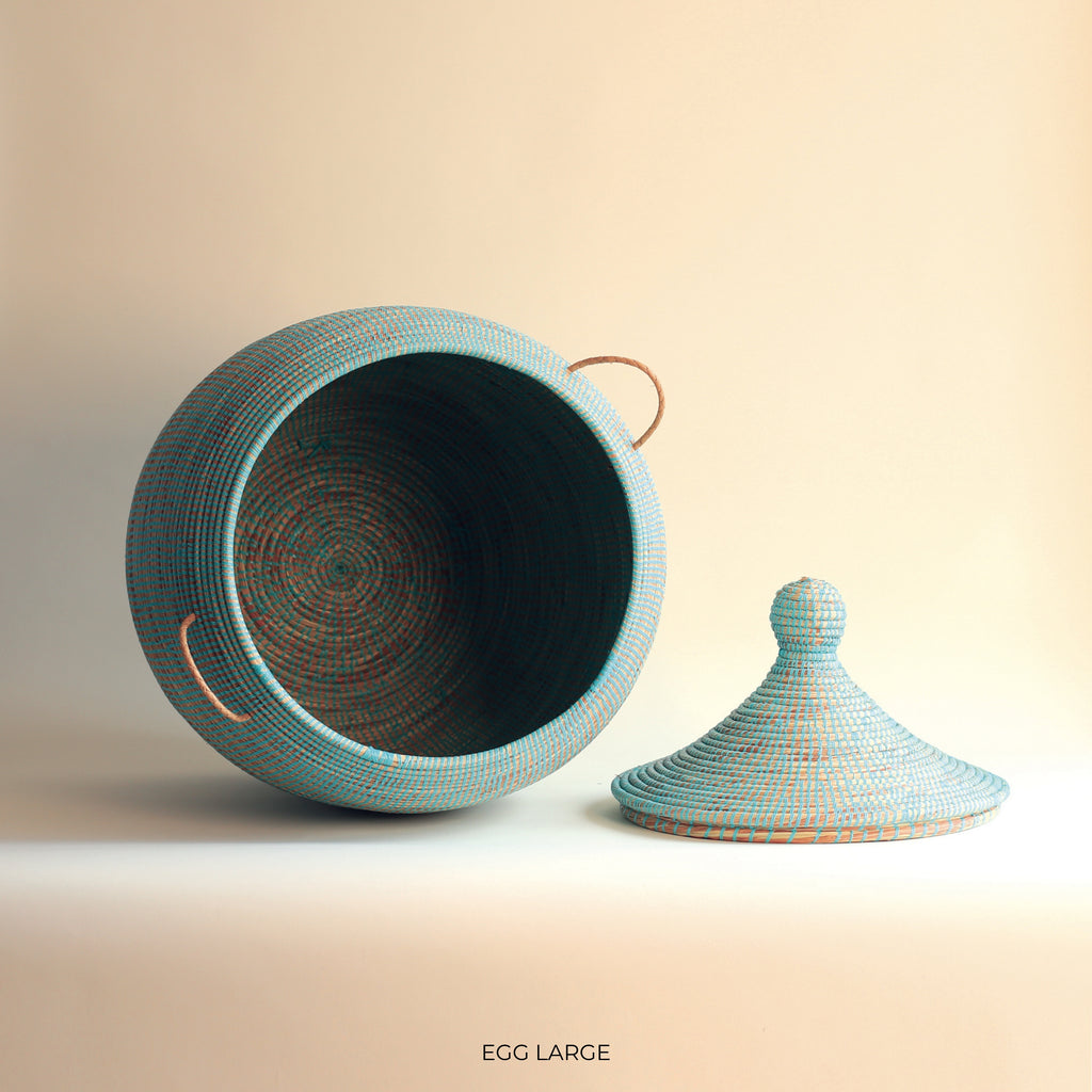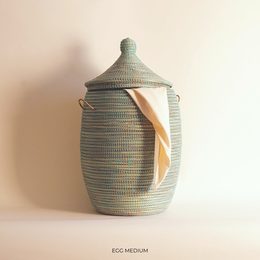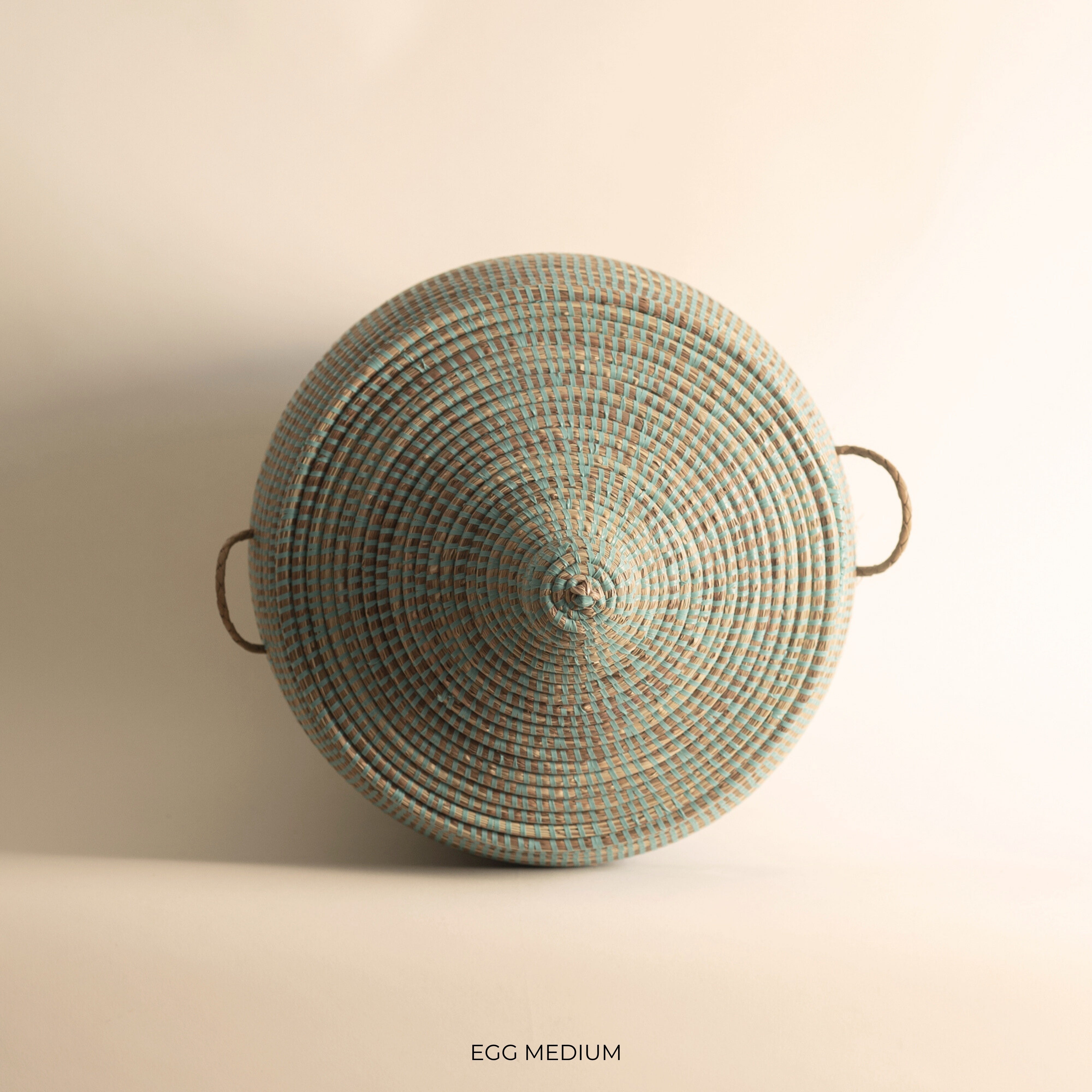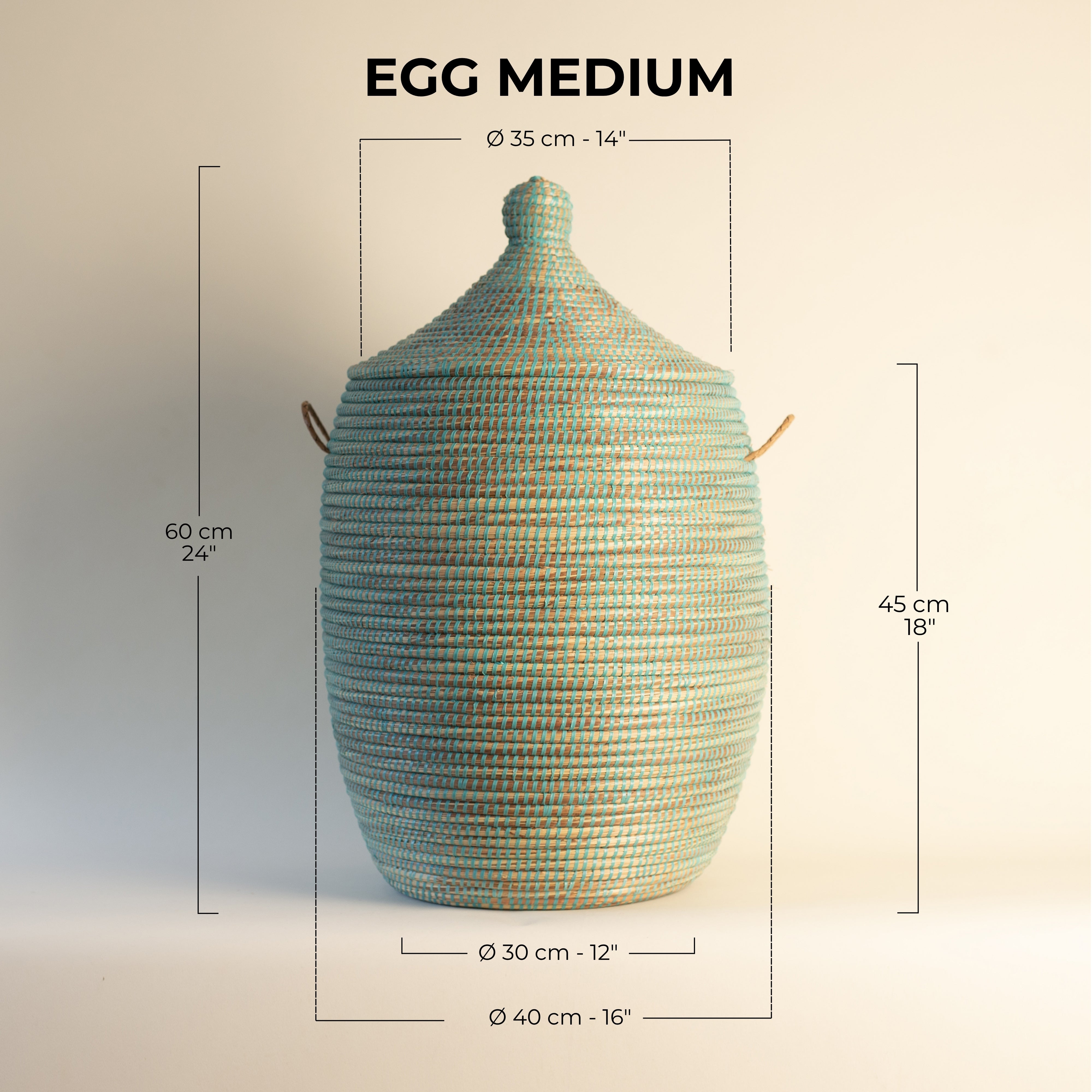 Practical and easy to carry, they come with leather handles and close with a fitted lid. You can use them to store laundry, toys, pillows, blankets, or any unsightly objects. Having good storage and organization in the home brings us serenity. The EGG baskets help eliminate clutter while brightening your decor with a beautiful, unique piece.
